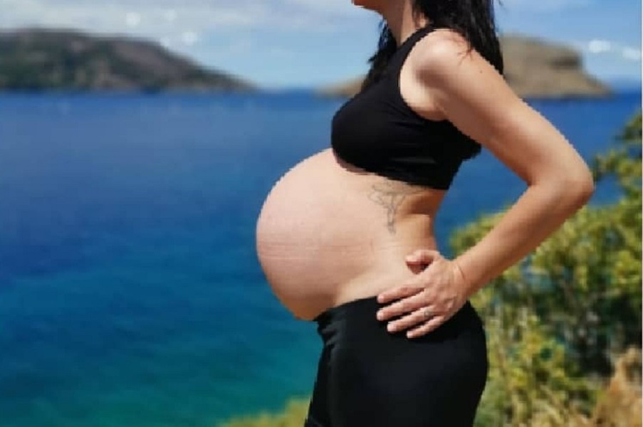Πόζαρε με φουσκωμένη κοιλίτσα στο Πόρτο Ράφτη που πήγε βόλτα και στη συνέχεια δημοσίευσε τη φωτογραφία στο instagram με λεζάντα: «Λίγο πριν έρθει ο μικρός μας μάγος #soulalwaysyoung #pentajunior #lamafamilia #agapire».