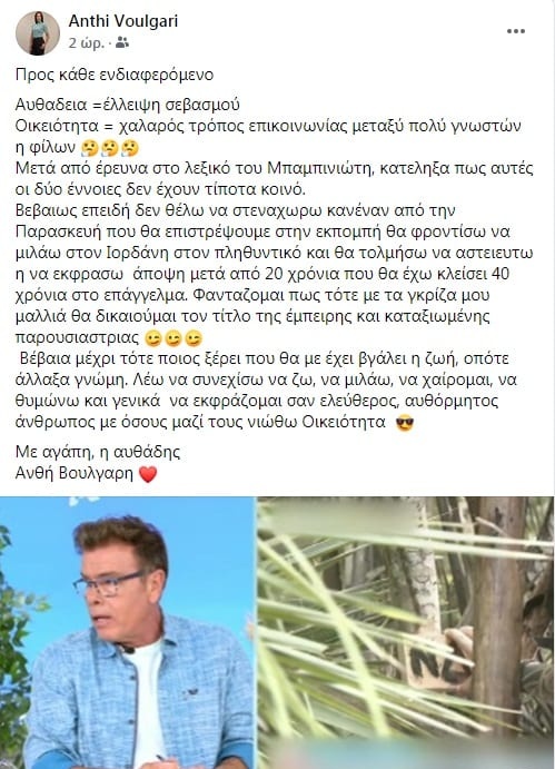 Η Ανθή Βούλγαρη απάντησε λίγο αργότερα μέσω facebook με το εξής ποστ: «Προς κάθε ενδιαφερόμενο. Αυθάδεια = έλλειψη σεβασμού. Οικειότητα = χαλαρός τρόπος επικοινωνίας μεταξύ πολύ γνωστών η φίλων. Μετά από έρευνα στο λεξικό του Μπαμπινιώτη, κατέληξα πως αυτές οι δύο έννοιες δεν έχουν τίποτα κοινό. Βεβαίως επειδή δεν θέλω να στεναχωρώ κανέναν από την Παρασκευή που θα επιστρέψουμε στην εκπομπή θα φροντίσω να μιλάω στον Ιορδάνη στον πληθυντικό και θα τολμήσω να αστειευτώ ή να εκφράσω άποψη μετά από 20 χρόνια που θα έχω κλείσει 40 χρόνια στο επάγγελμα. Φαντάζομαι πως τότε με τα γκρίζα μου μαλλιά θα δικαιούμαι τον τίτλο της έμπειρης και καταξιωμένης παρουσιάστριας. Bέβαια μέχρι τότε ποιος ξέρει που θα με έχει βγάλει η ζωή, οπότε άλλαξα γνώμη. Λέω να συνεχίσω να ζω, να μιλάω, να χαίρομαι, να θυμώνω και γενικά να εκφράζομαι σαν ελεύθερος, αυθόρμητος άνθρωπος με όσους μαζί τους νιώθω Οικειότητα. Με αγάπη, η αυθάδης Ανθή Βούλγαρη».