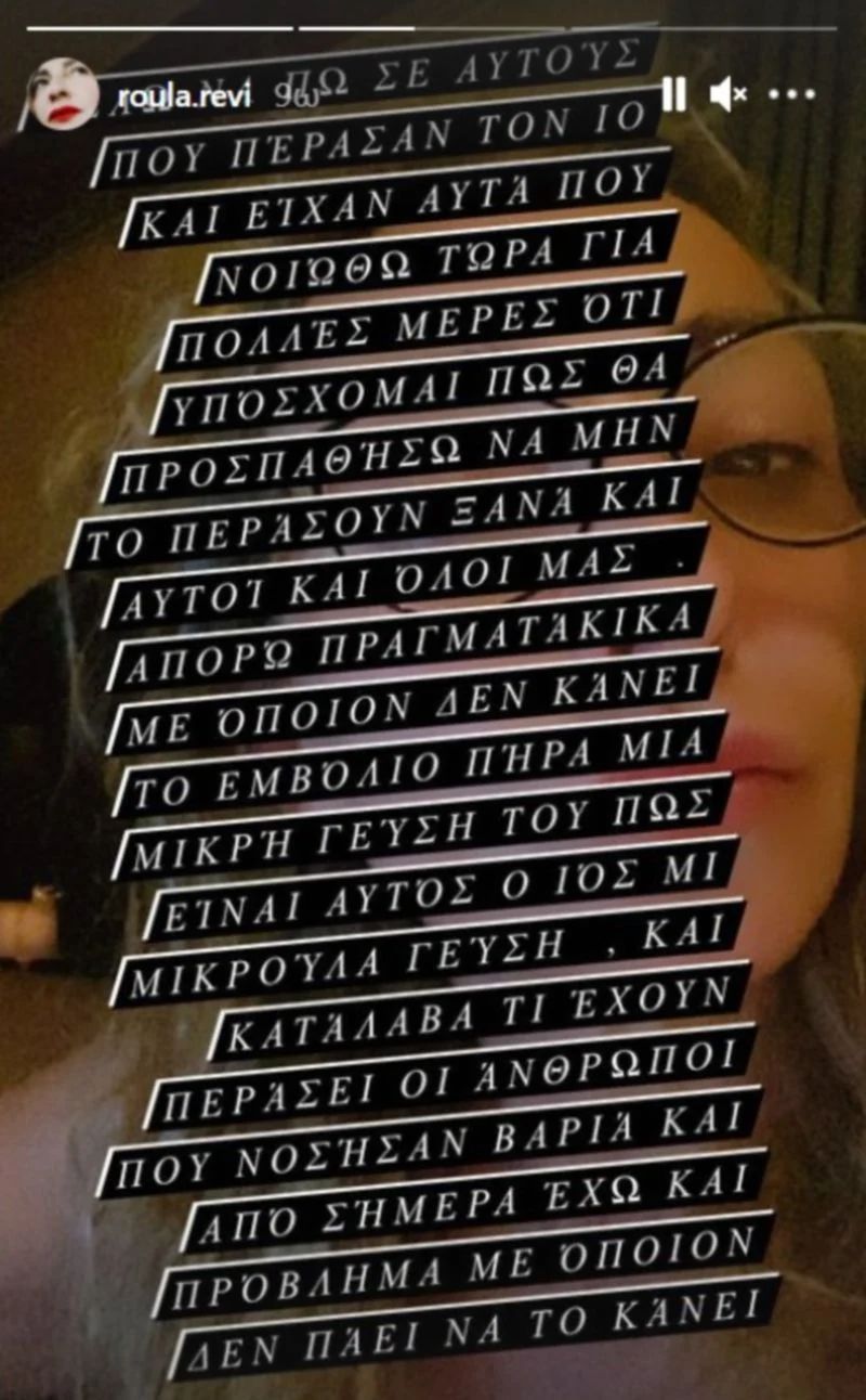 «Ζω με πυρετό και πόνο αλλά ζω και είμαι ελεύθερη», έγραψε στο αρχικό της post και συνέχισε: «Θέλω να πω σε αυτούς που πέρασαν τον ιο και είχαν αυτά που νιώθω τώρα για πολλές μέρες ότι θα προσπαθήσω να μην το περάσουν ξανά και αυτοί και όλοι μας. Απορώ πραγματικά με όποιον δεν κάνει το εμβόλιο. Πήρα μια μικρή γεύση του πως είναι αυτός ο ιός και κατάλαβα τι έχουν περάσει οι άνθρωποι που νόσησαν βαριά και από σήμερα έχω και πρόβλημα με όποιον δεν κάνει το εμβόλιο»