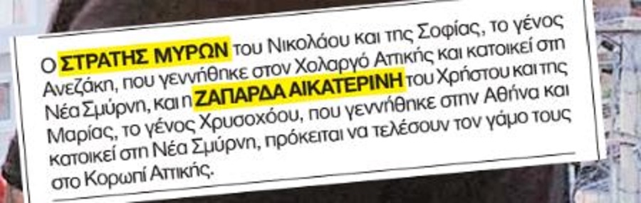 Το ζευγάρι, το οποίο είναι μαζί εδώ και πέντε χρόνια, επισφραγίζοντας τον έρωτά του με τον ερχομό του μικρού Νικόλα (τα βαφτίσια μάλιστα του μπόμπιρα έγιναν μόλις πριν από μερικές εβδομάδες), ετοιμάζεται να παντρευτεί και μάλιστα λίαν συντόμως, όπως μαρτυρά και η αγγελία γάμου την οποία δημοσιεύει σήμερα αποκλειστικά η «Espresso»!