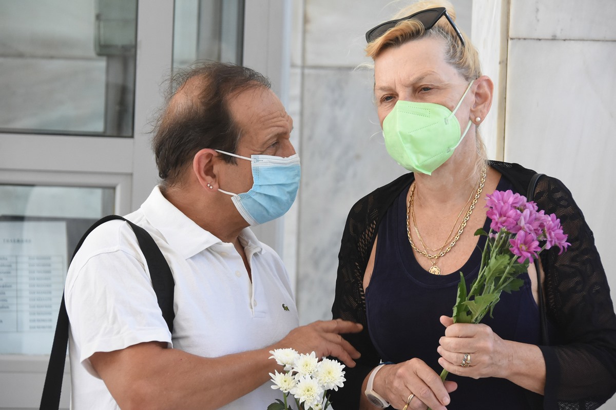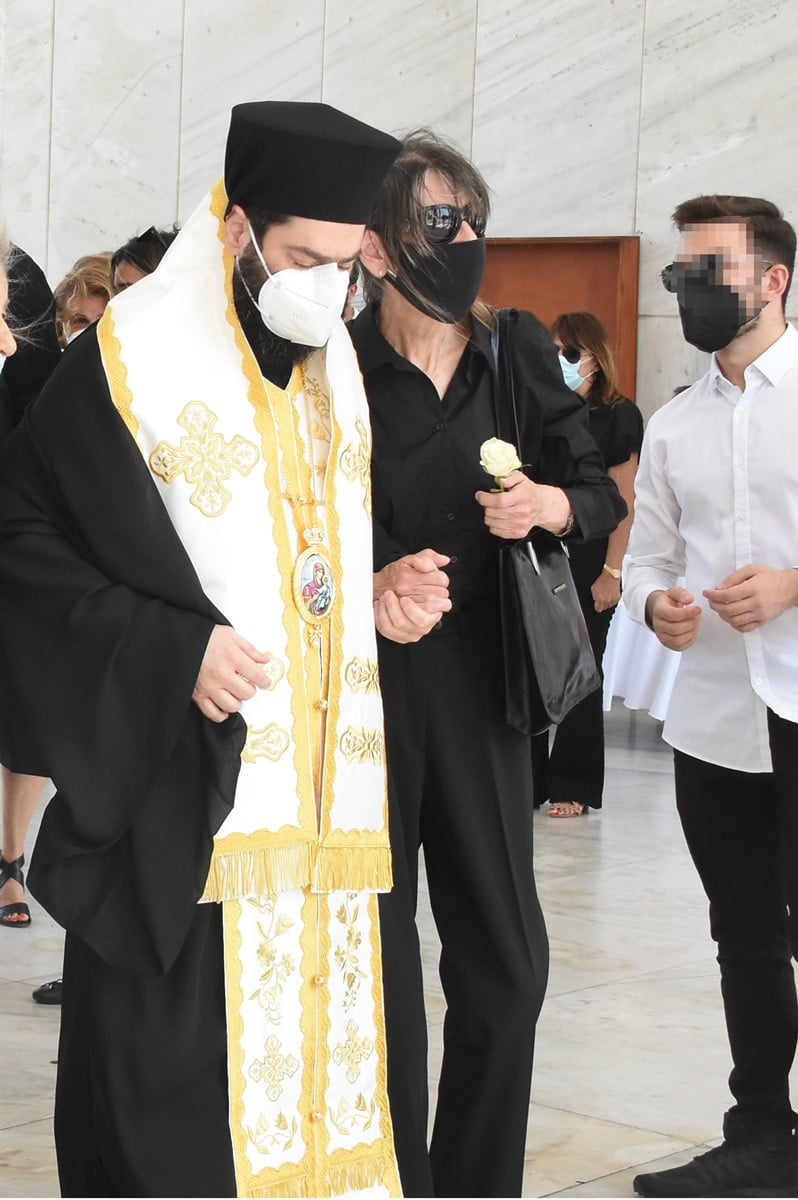 Η σύζυγός του, Ντίνα Θέμελη ντυμένη στα μαύρα και φανερά συντετριμμένη έφτασε στην εκκλησία.