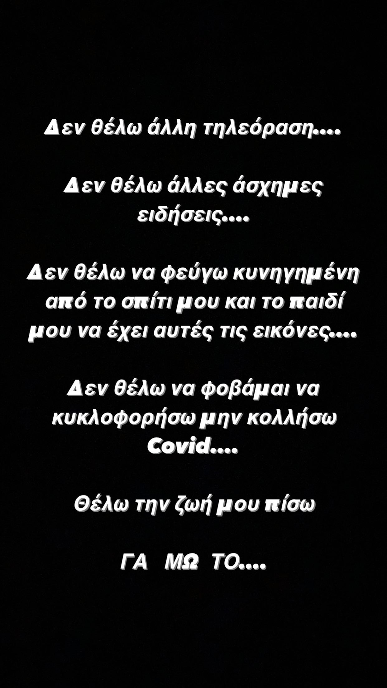 Δεν θέλω άλλη τηλεόραση. Δεν θέλω άλλες άσχημες ειδήσεις. Δεν θέλω να φεύγω κυνηγημένη από το σπίτι και το παιδί μου να έχεις αυτές τις εικόνες. Δεν θέλω να φοβάμαι να κυκλοφορήσω μην κολλήσω Covid. Θέλω τη ζωή μου πίσω
