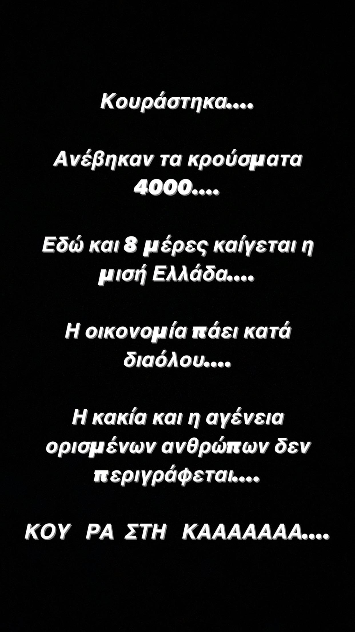 «Κουράστηκα… Ανέβηκαν τα κρούσματα στις 4.000. Εδώ και 8 μέρες καίγεται η μισή Ελλάδα. Η οικονομία πάει κατά δι@όλου. Η κακία και η αγένεια ορισμένων ανθρώπων δεν περιγράφεται. ΚΟΥΡΑΣΤΗΚΑ.