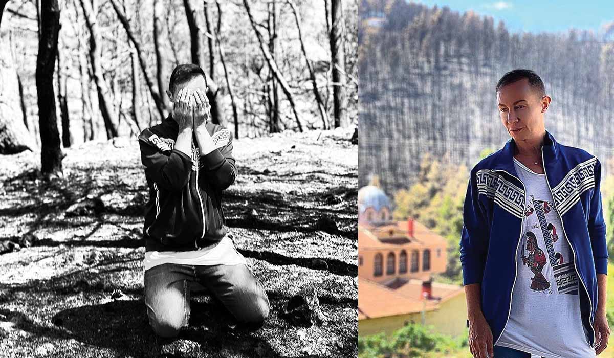 «Πάντως, το μεγαλύτερο σοκ το έπαθα τον Δεκαπενταύγουστο στη μονή του Οσίου Δαυίδ, όπου πήγα για να προσκυνήσω και να ακούσω τη λειτουργία του πάτερ Γαβριήλ. Τα έχασα από τις εικόνες που αντίκρισα. Είδα καμένα πρόβατα, δέντρα χιλιάδων χρόνων απανθρακωμένα. Γύρω γύρω από το μοναστήρι ήταν τα πάντα καμένα, εκτός απ’ αυτό. Πραγματικά, γονάτισα. Δεν μπορούσα να σταθώ όρθιος μπροστά σε αυτές τις εικόνες. Η καταστροφή είναι τεράστια, θυμίζει αποκάλυψη. Οι πυροσβέστες και οι άνθρωποι εδώ κυριολεκτικά είναι ήρωες που καταφέρανε να σταματήσουν τη φωτιά» σημειώνει.