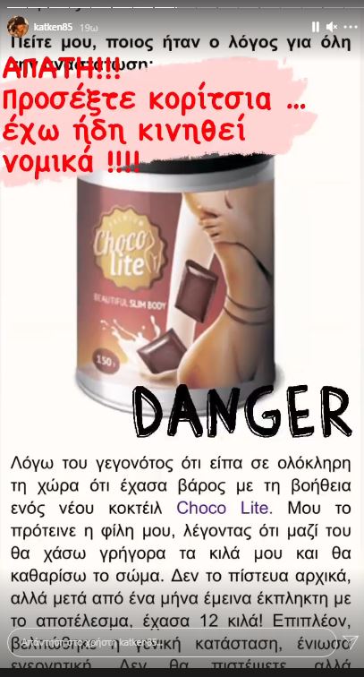 Συγκεκριμένα, πρόκειται για την προώθηση ενός αμφιβόλου προελεύσεως προϊόντος αδυνατίσματος, το οποίο οι επιτήδειοι που έχουν βάλει στο… μάτι την Κατερίνα ισχυρίζονται ότι χρησιμοποιούσε κι εκείνη σταθερά προκειμένου να διατηρεί το καλοσχηματισμένο της κορμί στα επίπεδα που επιθυμεί η ίδια, αλλά και για να χάσει μερικά ακόμα κιλά.
