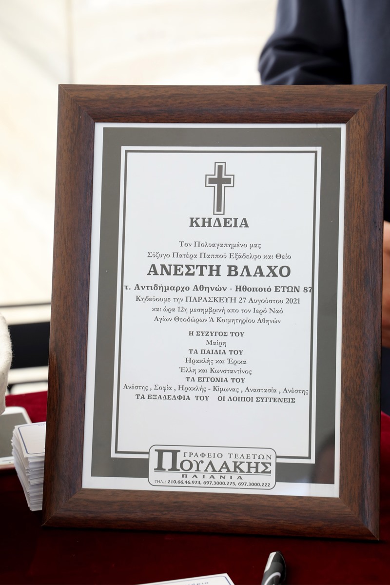 Η οικογένειά του εξέδωσε ανακοίνωση για το πότε θα γίνει η κηδεία του. «Mε βαθυτάτη οδύνη ανακοινώνουμε την απώλεια του πολυαγαπημένου μας πατέρα και παππού Ανέστη Βλάχου. Ο Ανέστης Βλάχος έδωσε μία γενναία μάχη για τη ζωή, τον τελευταίο σχεδόν ένα μήνα που νοσηλευόταν στο νοσοκομείο «Ευαγγελισμός».