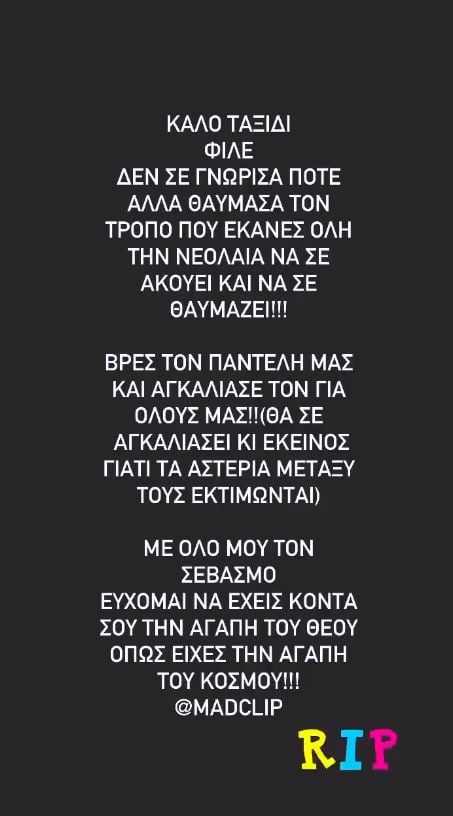 «Καλό ταξίδι φίλε. Δεν σε γνώρισα ποτέ αλλά θαύμασα τον τρόπο που έκανες όλη τη νεολαία να σε ακούει και να σε θαυμάζει. Βρες τον Παντελή μας και αγκάλιασέ τον για όλους μας. (Θα σε αγκαλιάσει κι εκείνος γιατί τα αστέρια μεταξύ τους εκτιμώνται). Με όλο το σεβασμό να έχεις κοντά σου την αγάπη του Θεού όπως είχε την αγάπη του κόσμου», έγραψε ο Γιάννης Κρητικός στο instastory του.