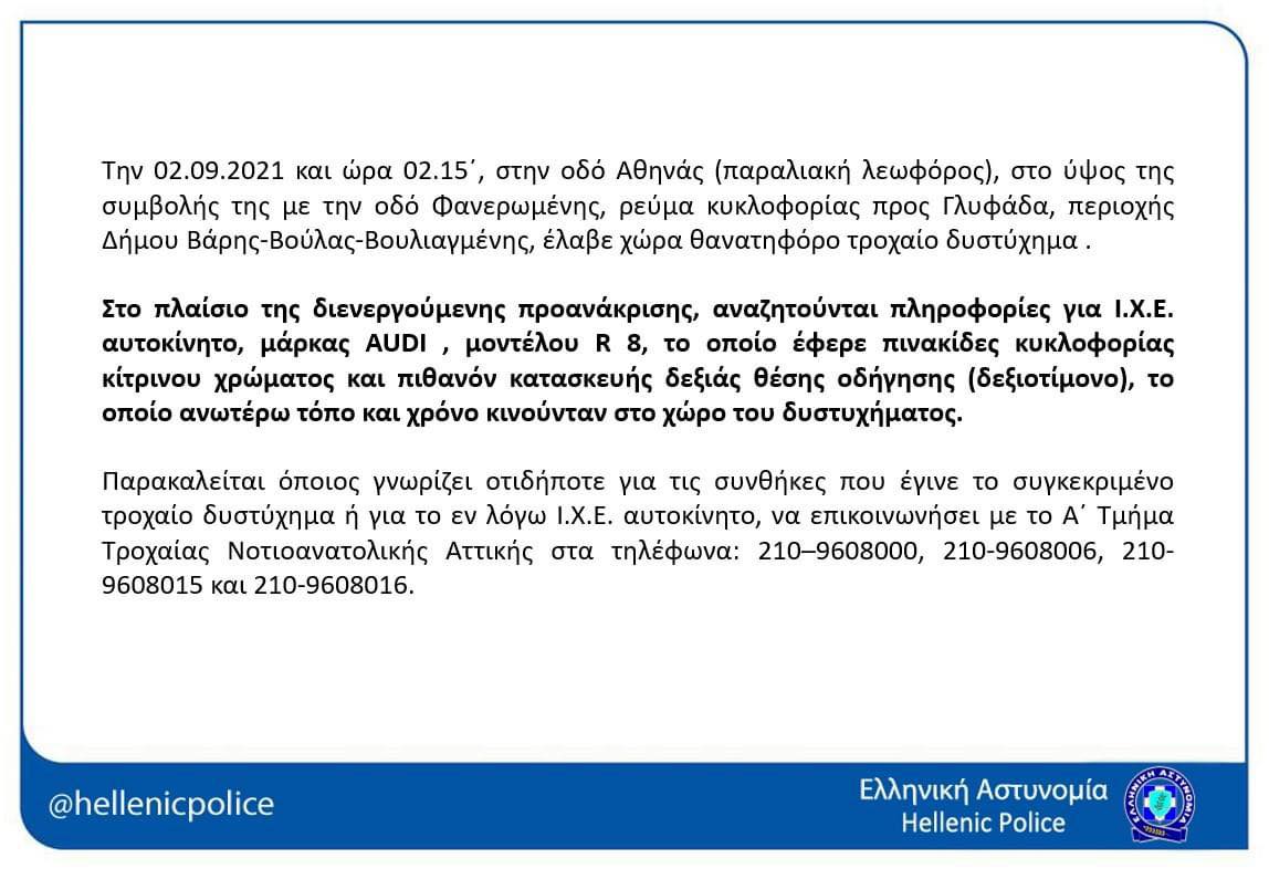 «Την 02.09.2021 και περί ώρα 02.15΄, στην οδό Αθηνάς (παραλιακή λεωφόρος), στο ύψος της συμβολής της με την οδό Φανερωμένης, ρεύμα κυκλοφορίας προς Γλυφάδα, περιοχής Δήμου Βάρης-Βούλας-Βουλιαγμένης, έλαβε χώρα θανατηφόρο τροχαίο δυστύχημα.