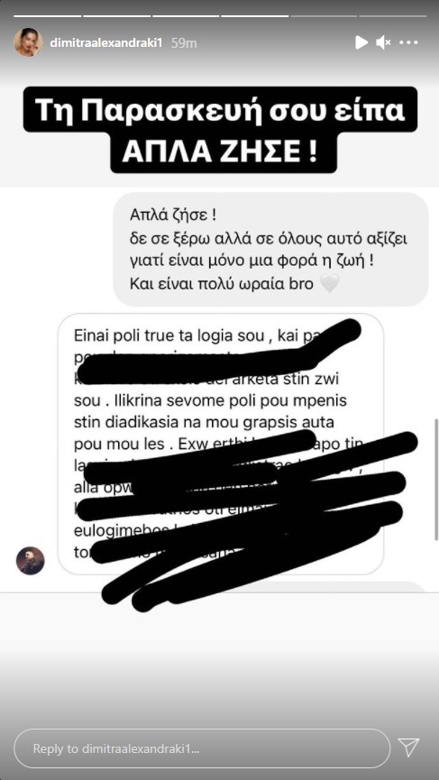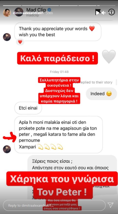 Δεν τον γνώριζε αλλά πρόσφατα είχαν μιλήσει μέσω των social media και δημοσίευσε τις συνομιλίες τους μετά το θάνατό του καθώς δεν μπορούσε να το πιστέψει. «Τη Παρασκευή σου είπα απλά ζήσε. Καλό παράδεισο», έγραψε η Δήμητρα Αλεξανδράκη.