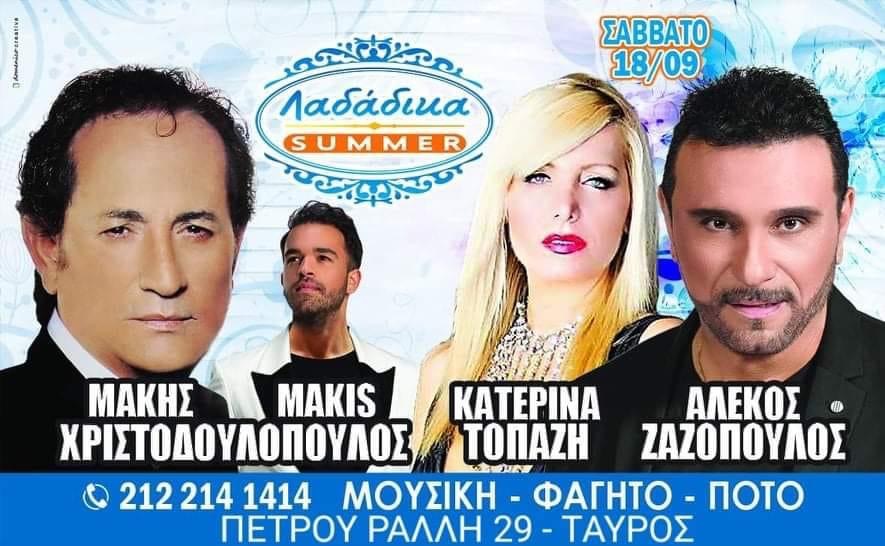Ο σπουδαίος Μάκης Χριστοδουλόπουλος, ο διασκεδαστής Αλέκος Ζαζόπουλος, και η εκρηκτική Κατερίνα Τοπάζη, από το Σάββατο 18 Σεπτεμβρίου, και μόνο για μερικά Σάββατα, έρχονται με φόρα στα «Λαδάδικα Summer», για να μας δείξουν, πώς είναι η αυθεντική διασκέδαση.