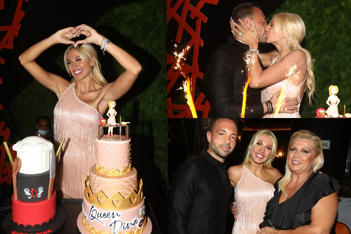 Φορώντας ένα αέρινο, ροζ φόρεμα έφτασε νωρίς στο μαγαζί με το σύντροφό της, Βασίλη Σταθοκωστόπουλο και τη μητέρα της ώστε να υποδεχτούν τους καλεσμένους. Πολλοί «επώνυμοι» της σόουμπιζ έδωσαν το «παρών» για να γιορτάσουν μαζί με τη «Queen Dina» όπως έγραφαν πάνω οι δύο τούρτες της τα 34α της γενέθλια.