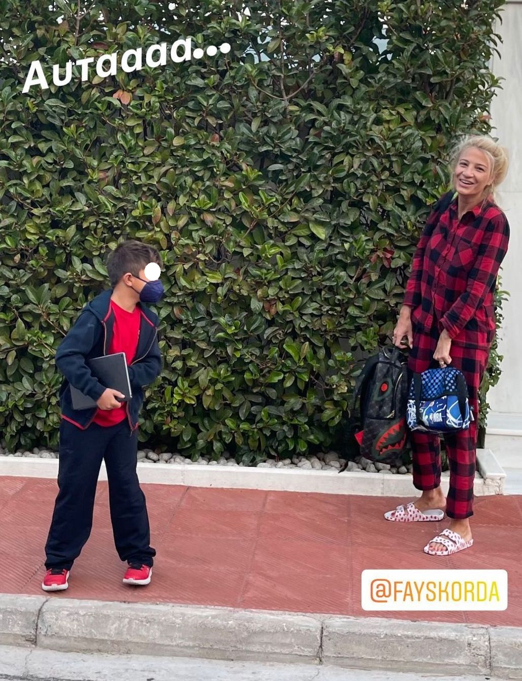 Δημοσίευσε τη Φαίη Σκορδά αμακιγιάριστη, με πιτζάμες και παντόφλες να βάζει τα παιδιά στο σχολικό.