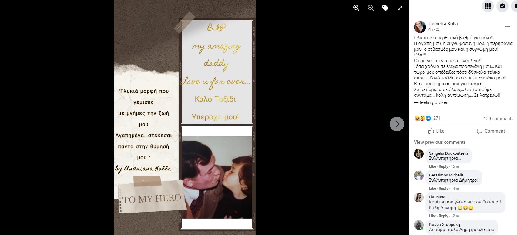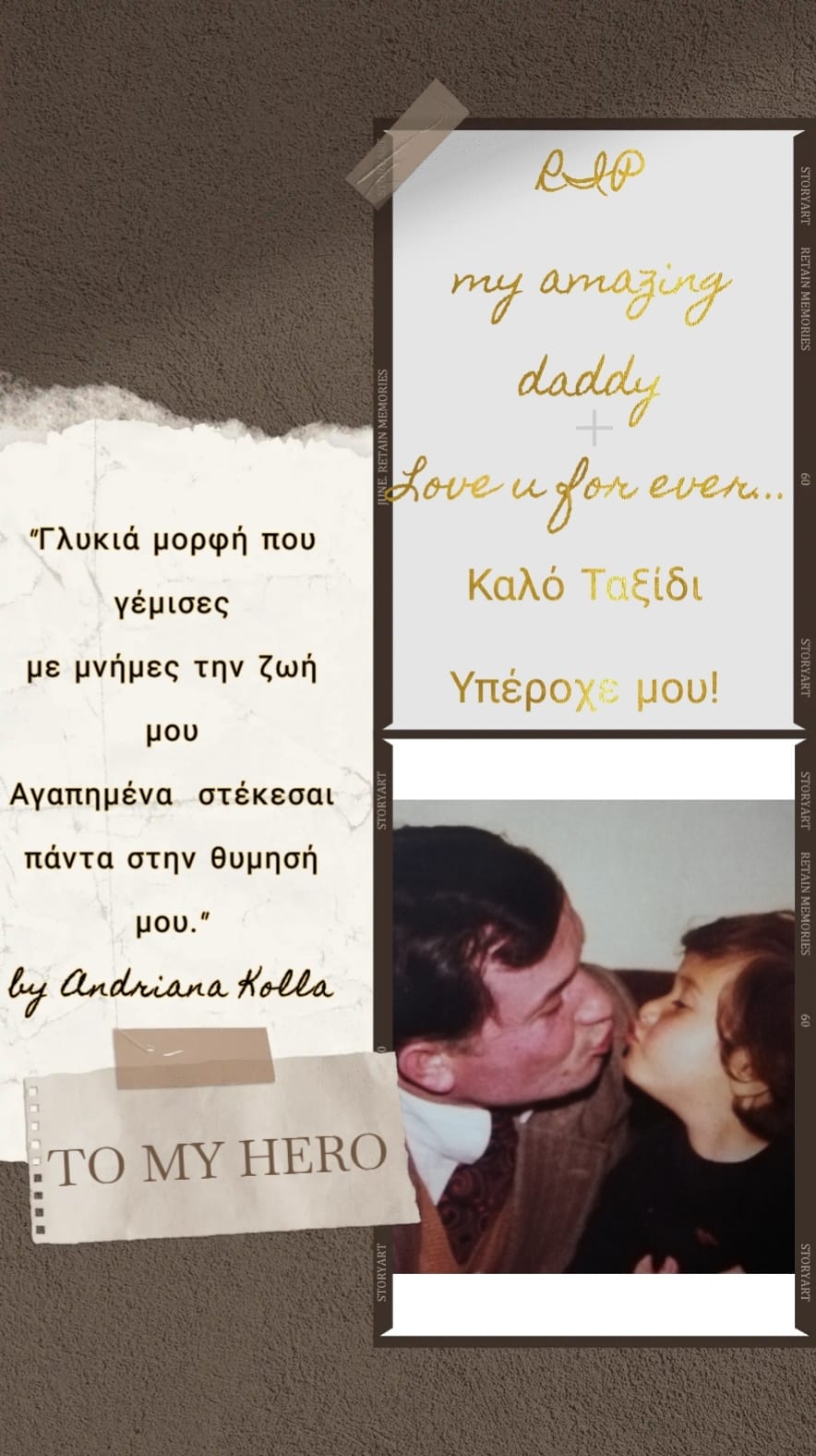 Ότι κι να πω για σένα είναι λίγο!! Τόσα χρόνια σε έλεγα πορσελάνη μου… Και τώρα μου απέδειξες πόσο δύσκολα τελικά σπάει. Καλό ταξίδι στο φως μπαμπάκα μου!! Θα είσαι ο ήρωας μου για πάντα!! Χαιρετίσματα σε όλους… Θα τα πούμε σύντομα… Καλή αντάμωση…. Σε λατρεύω!!».