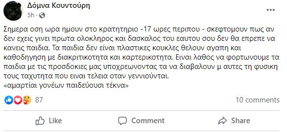 Ενώ στις 9 το πρωί επανήλθε με νέο ποστ: «Σήμερα όση ώρα ήμουν στο κρατητήριο -17 ώρες περίπου – σκεπτόμουν πως αν δεν έχεις γίνει πρώτα ολόκληρος και δάσκαλος του εαυτού σου δεν θα έπρεπε να κάνεις παιδιά. Τα παιδιά δεν είναι πλαστικές κούκλες, θέλουν αγάπη και καθοδήγηση με διακριτικότητα και καρτερικότητα. Είναι λάθος να φορτώνουμε τα παιδιά με τις προσδοκίες μας υποχρεώνοντας τα να διαβάλλουν μ’ αυτές τη φυσική τους ταχύτητα που είναι τέλεια όταν γεννιούνται. “αμαρτίαι γονέων παιδεύουσι τέκνα”».