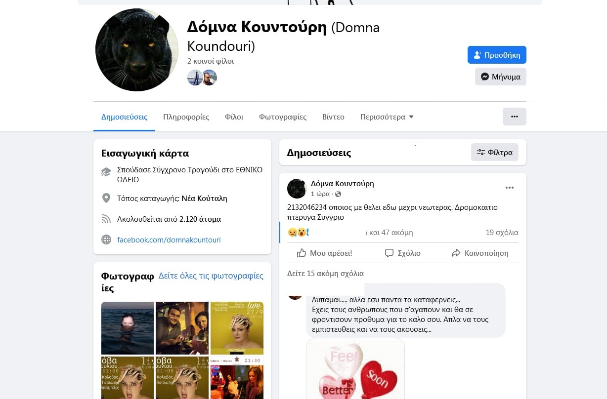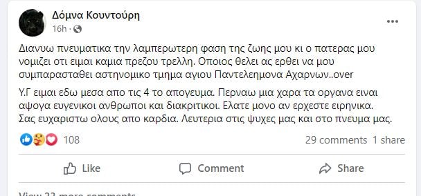 Λίγες ώρες πριν, γύρω στις 10 το βράδυ της Κυριακής έγραφε σε ποστ της στο facebook: «Διανύω πνευματικά τη λαμπερότερη φάση της ζωής μου κι ο πατέρας μου νομίζει ότι είμαι καμιά πρεζου τρελή. Όποιος θέλει ας έρθει να μου συμπαρασταθεί αστυνομικό τμήμα Αγίου Παντελεήμονα Αχαρνων..over Υ.Γ είμαι εδω μέσα από τις 4 το απόγευμα. Περνάω μια χαρά τα όργανα είναι άψογα, ευγενικοί άνθρωποι και διακριτικοί. Ελάτε μόνο αν έρχεστε ειρηνικά. Σας ευχαριστώ όλους από καρδιάς. Λευτεριά στις ψυχές μας και στο πνεύμα μας».