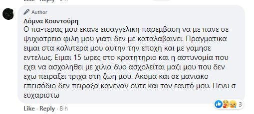 Όταν τη ρώτησαν διαδικτυακοί της φίλοι τη έγινε έγραψε: «Ο πα-τερας μου έκανε εισαγγελική παρέμβαση να με πάνε σε ψυχιατρείο φιλη μου γιατί δεν με καταλάβαινε. Πραγματικά είμαι στα καλύτερά μου αυτήν την εποχή και με γ@@@σε εντελώς. Είμαι 15 ωρες στο κρατητήριο και η αστυνομία που έχει να ασχοληθεί με χίλια δυο ασχολείται μαζί μου που δεν έχω πειράξει τρίχα στη ζωή μου. Ακόμα και σε μανιακό επεισόδιο δεν πείραξα κανέναν ούτε και τον εαυτό μου».