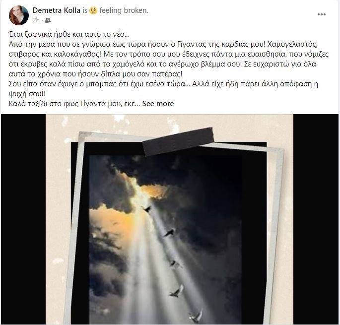«Έτσι ξαφνικά ήρθε και αυτό το νέο… Από την μέρα που σε γνώρισα έως τώρα ήσουν ο Γίγαντας της καρδιάς μου! Χαμογελαστός, στιβαρός και καλοκάγαθος! Με τον τρόπο σου μου έδειχνες πάντα μια ευαισθησία, που νόμιζες ότι έκρυβες καλά πίσω από το χαμόγελό και το αγέρωχο βλέμμα σου! Σε ευχαριστώ για όλα αυτά τα χρόνια που ήσουν δίπλα μου σαν πατέρας!