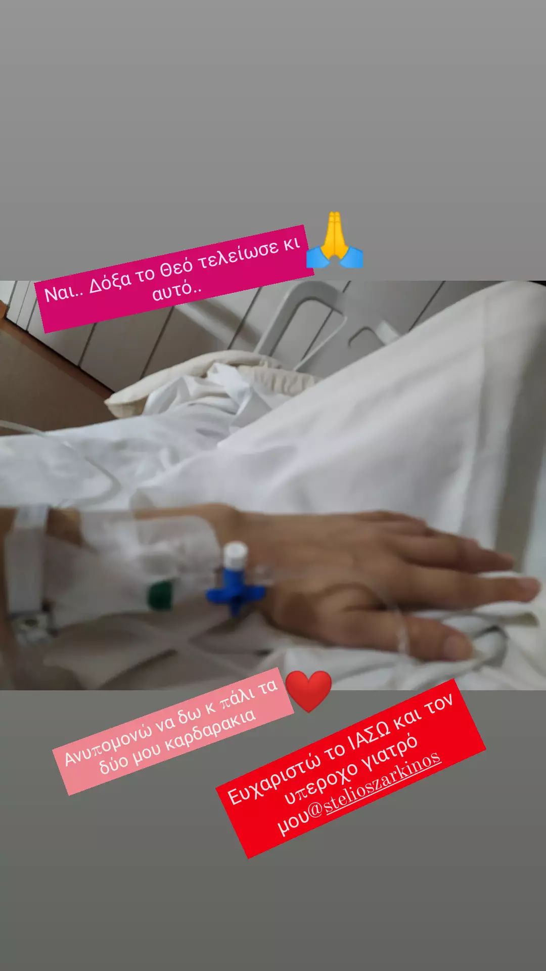 «Δόξα τω Θεώ τελείωσε κι αυτό. Ανυπομονώ να δω και πάλι τα δυο μου καρδαράκια», έγραψε ενώ προηγουμένως είχε ποστάρει: Λίγες ώρες μακριά σου… Και πόσο μου λείπεις πριγκίπισσα μου». Ωστόσο δεν θέλησε να πει περισσότερες λεπτομέρειες για το τι της συνέβη.