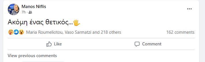 Ο Μάνος Νιφλής βρέθηκε θετικός στον κορονοϊό και το ανακοίνωσε στο facebook.