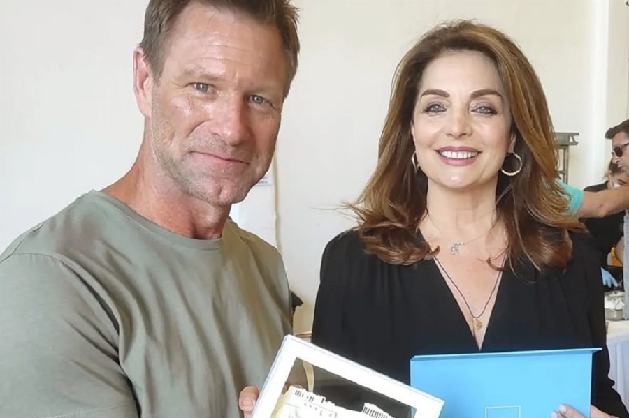 Όταν ο Ααρον Εκχαρτ συνάντησε την Άντζελα Γκερέκου θαύμασε τα γαλάζια μάτια της! Η πρόεδρος του ΕΟΤ και ο αντιπεριφερειάρχης Τουρισμού της Περιφέρειας Κεντρικής Μακεδονίας Αλέξανδρος Θάνος πήγαν στα τελευταία γυρίσματα του κατασκοπευτικού θρίλερ «Bricklayer», με πρωταγωνιστή τον ωραίο χολιγουντιανό star Ααρον Εκχαρτ.