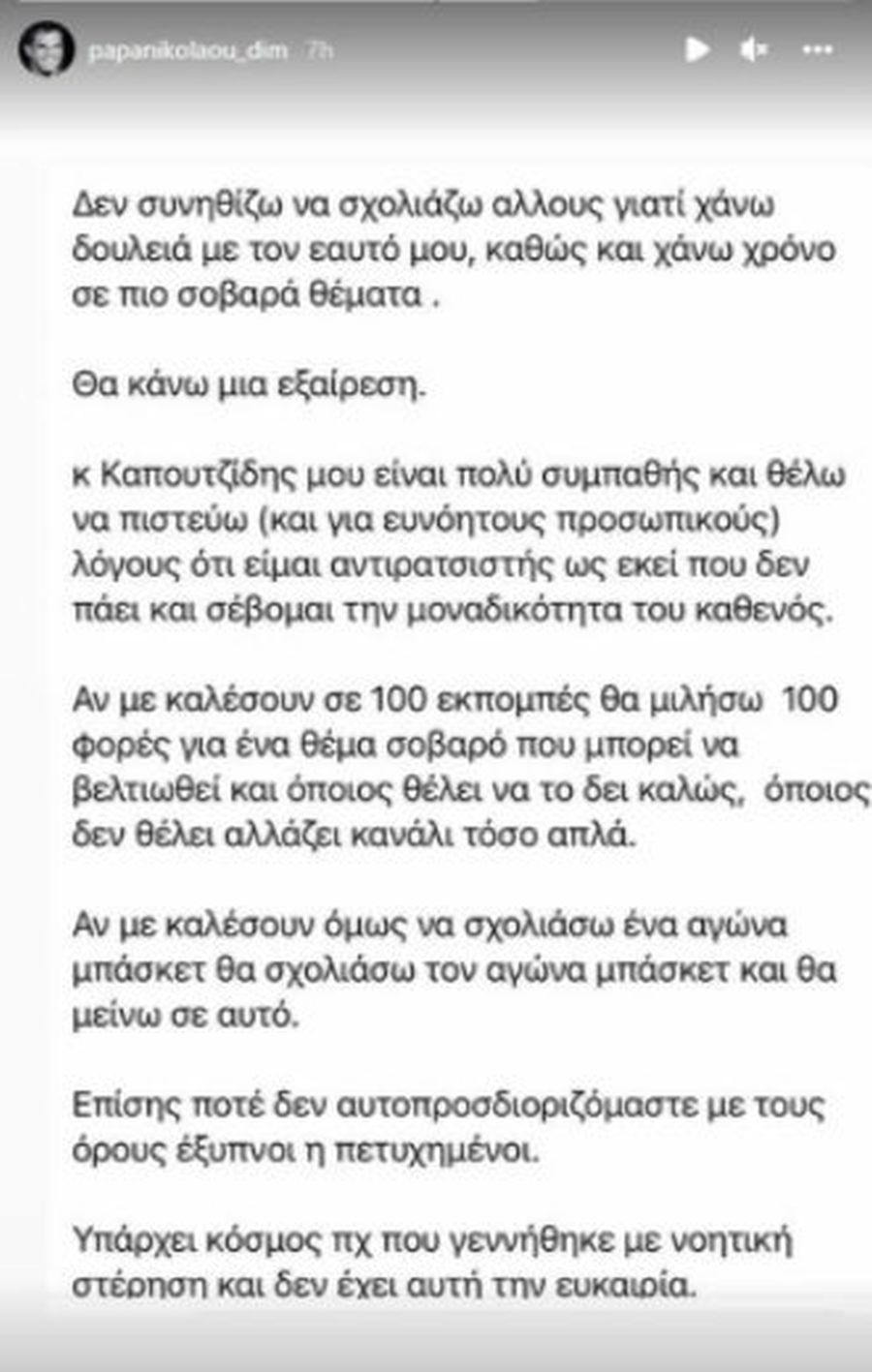 Αν με καλέσουν σε 100 εκπομπές, θα μιλήσω 100 φορές για ένα θέμα σοβαρό που μπορεί να βελτιωθεί και όποιος θέλει να το δει καλώς, όποιος δεν θέλει αλλάζει κανάλι, τόσο απλά. Αν με καλέσουν, όμως, να σχολιάσω έναν αγώνα μπάσκετ, θα σχολιάσω τον αγώνα μπάσκετ και θα μείνω σε αυτό. Επίσης, ποτέ δεν αυτοπροσδιοριζόμαστε με τους όρους “έξυπνοι” ή “πετυχημένοι”. Υπάρχει κόσμος, π.χ. που γεννήθηκε με νοητική στέρηση και δεν έχει αυτή την ευκαιρία»