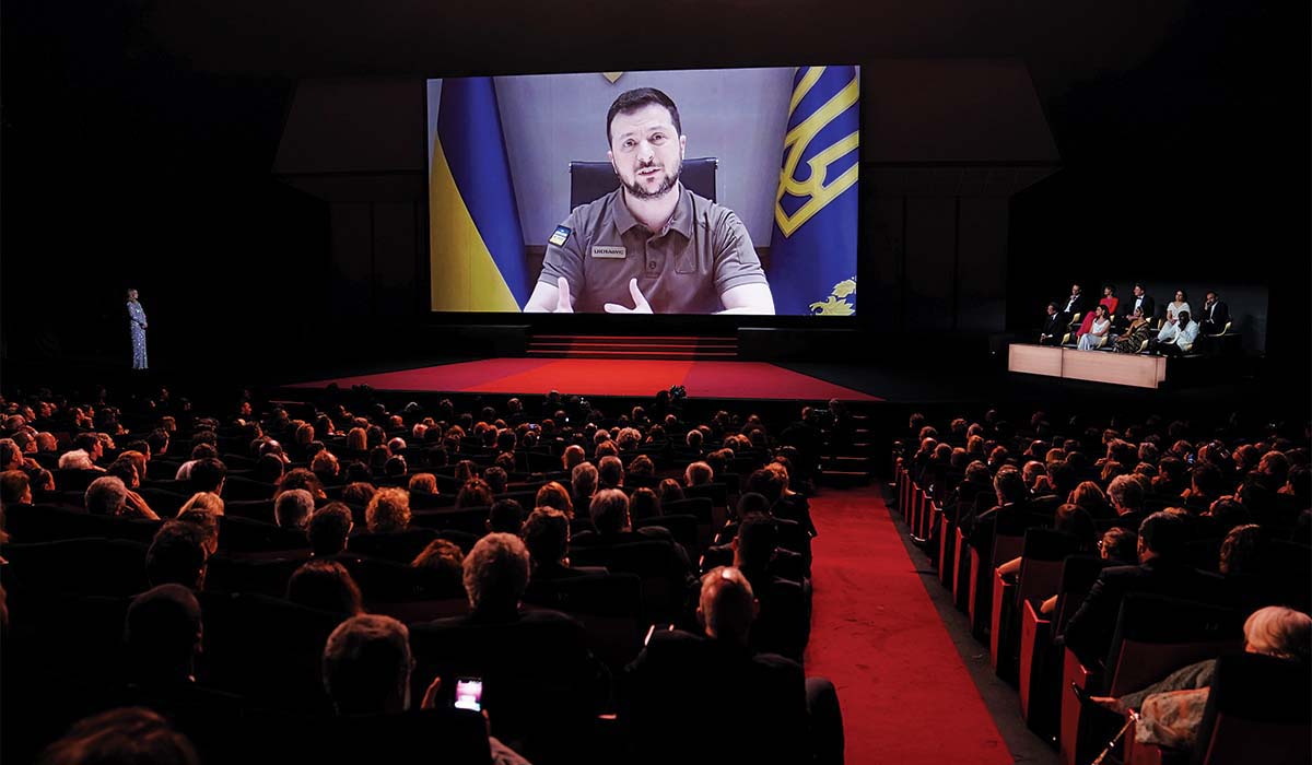 «Μας χρειάζεται ένας νέος Τσάπλιν, που θα αποδείξει ότι ο κινηματογράφος δεν είναι βουβός απέναντι στον πόλεμο στην Ουκρανία» δήλωσε ο Ουκρανός πρόεδρος από το Κίεβο. «Θα συνεχίσουμε να αγωνιζόμαστε, δεν έχουμε άλλη επιλογή. Είμαι πεπεισμένος ότι ο “δικτάτορας” θα χάσει» πρόσθεσε ενώπιον της αφρόκρεμας του παγκόσμιου κινηματογράφου.