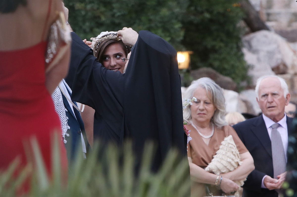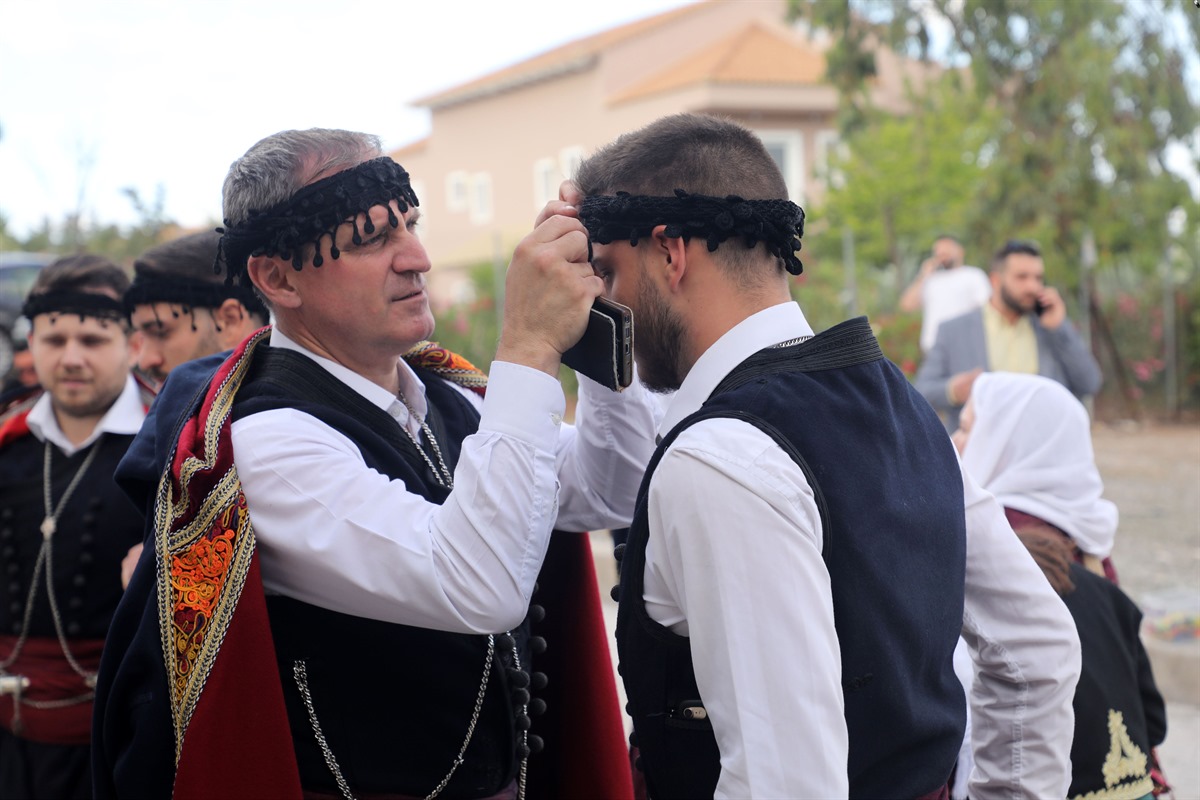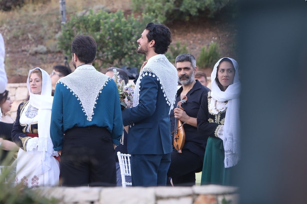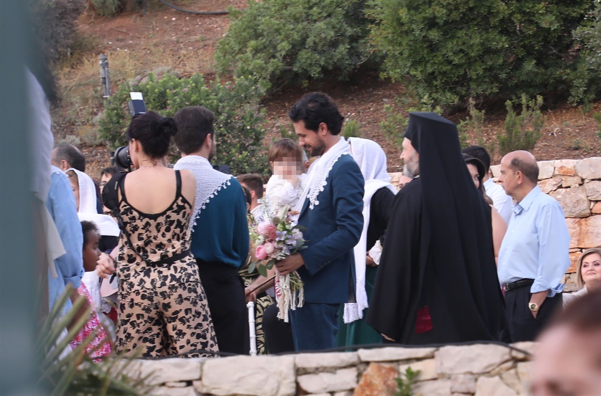 Ο γαμπρός για να τιμήσει την Κρήτη από όπου κατάγεται η μητέρα του φόρεσε στην πλάτη του και το κρητικό σαρίκι και περίμενε τη γυναίκα του κρατώντας αγκαλιά τον γιο τους.