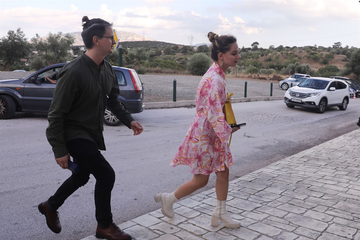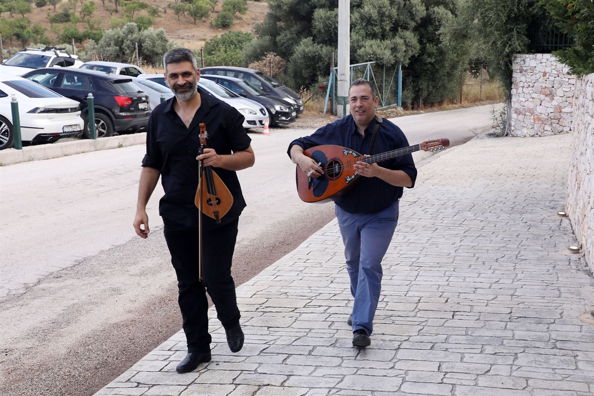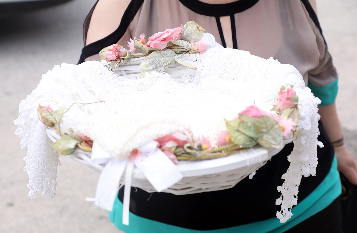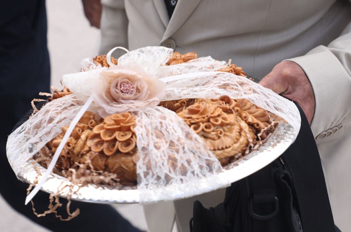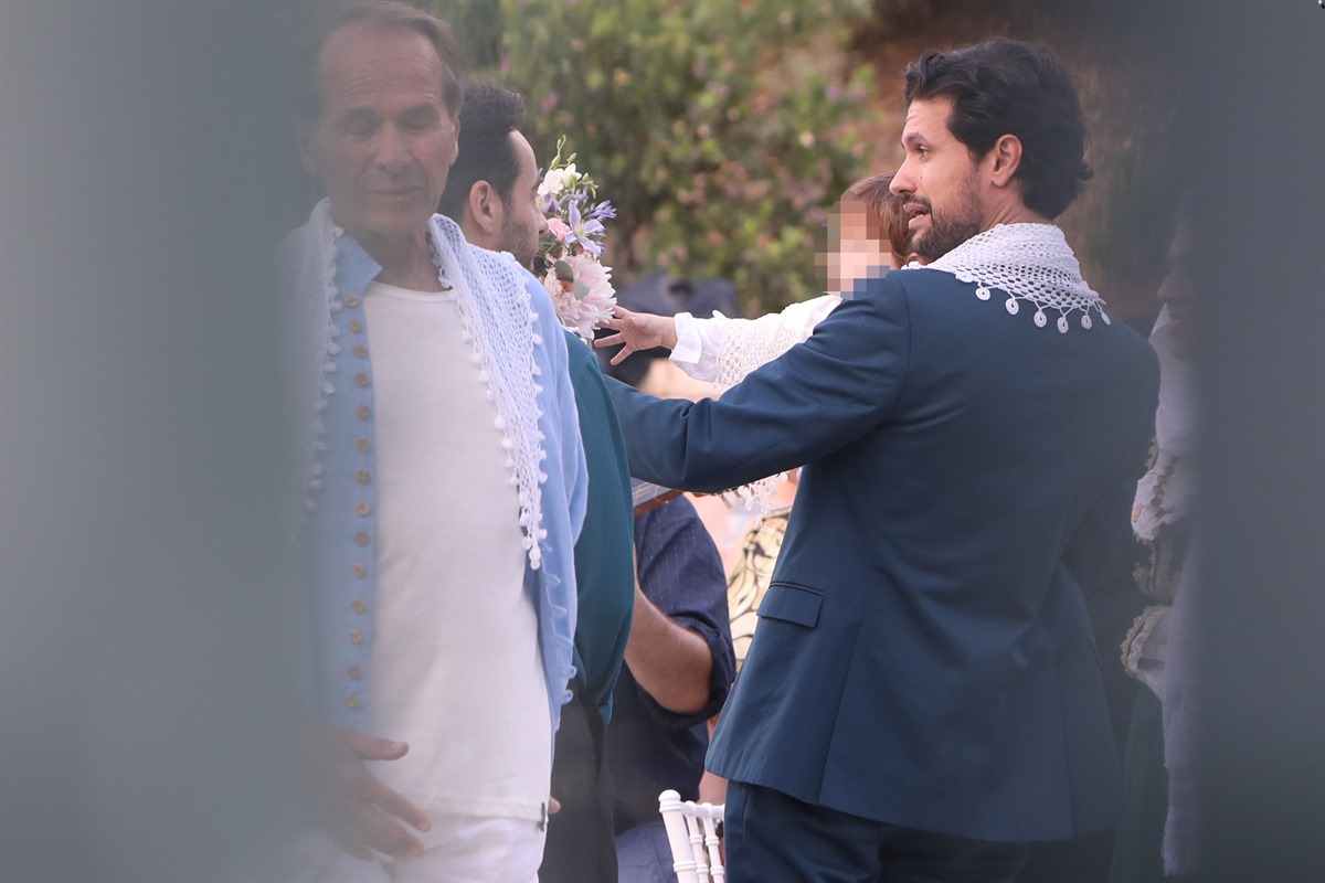 Ο γαμπρός για να τιμήσει την Κρήτη από όπου κατάγεται η μητέρα του φόρεσε στην πλάτη του και το κρητικό σαρίκι και περίμενε τη γυναίκα του κρατώντας αγκαλιά τον γιο τους.