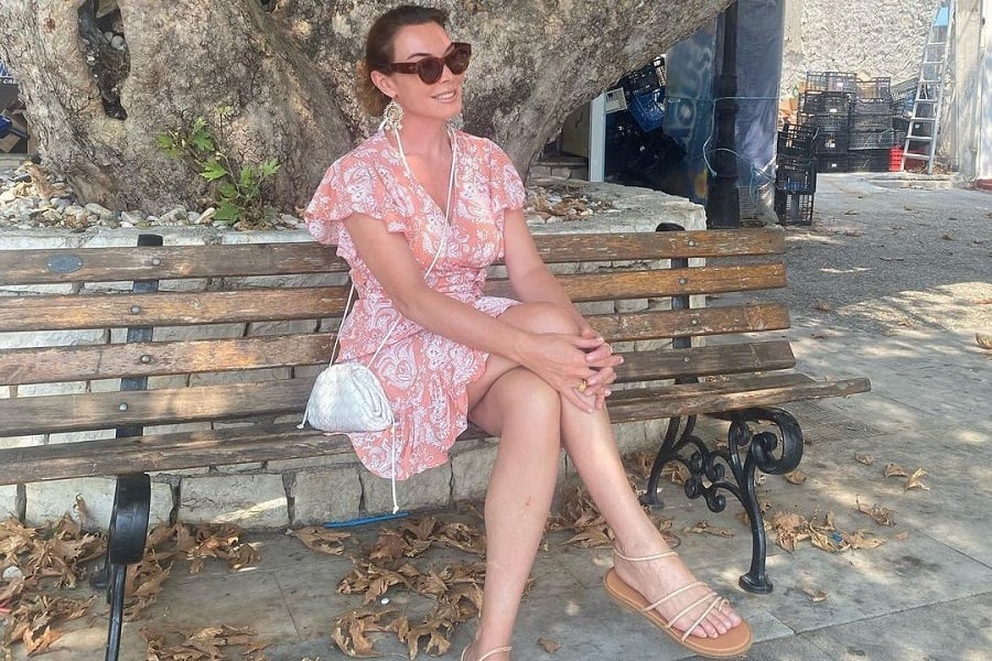 Ο Νίκος Ευαγγελάτος με το σκάφος τους, τους γυρίζει στα νησιά απολαμβάνοντας τις βουτιές τους και το φαγητό σε διάφορα μέρη. Η παρουσιάστρια πόζαρε σε ερημική παραλία στην άκρη της θάλασσας ξαπλωμένη φορώντας ένα λευκό μπικίνι.