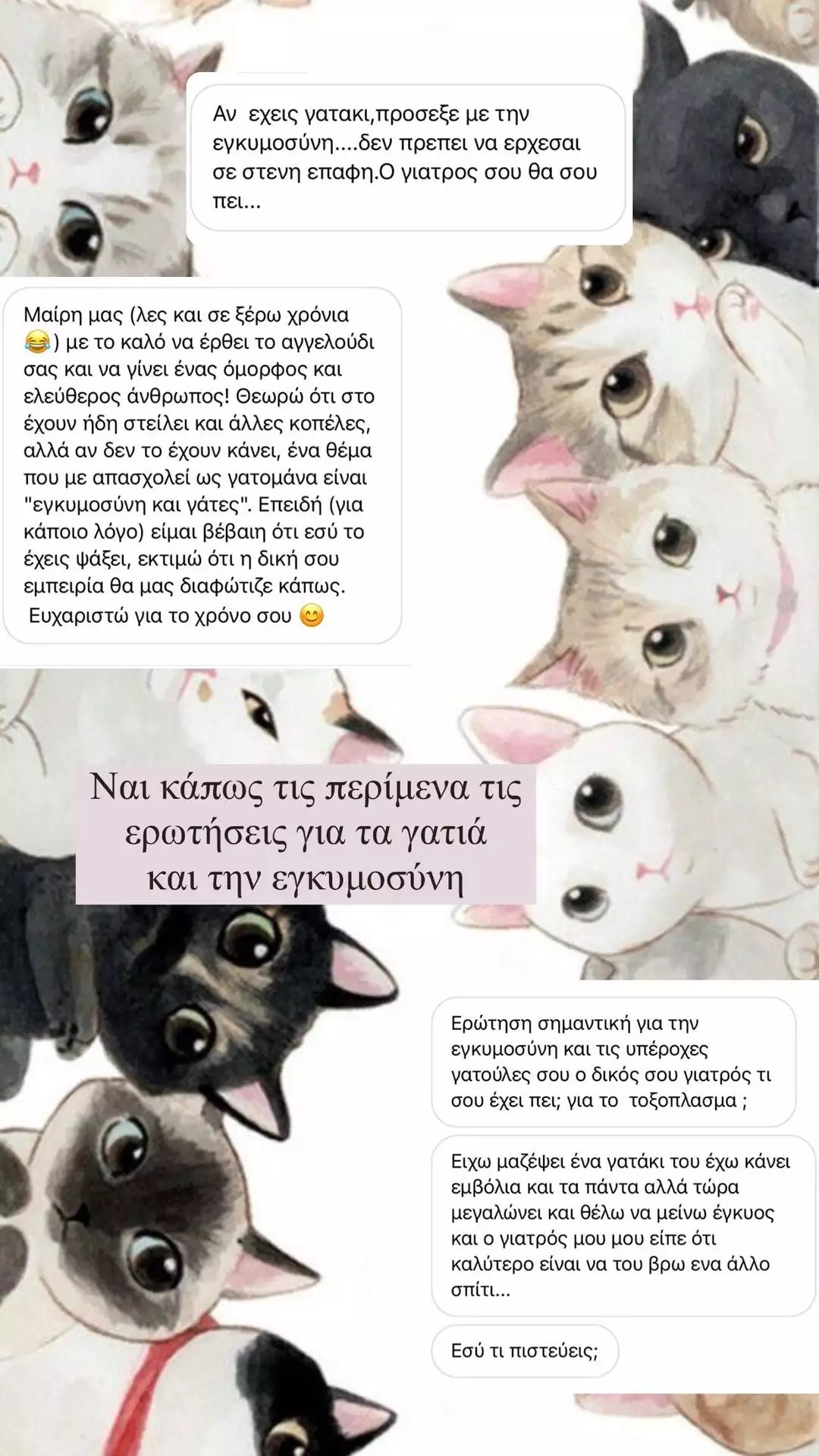 Η Μαίρη Συνατσάκη δέχτηκε κάποιες ερωτήσεις από followers της σχετικά με την εγκυμοσύνη και την επαφή της με τις γάτες καθώς υπάρχει κίνδυνος για τοξόπλασμα.
