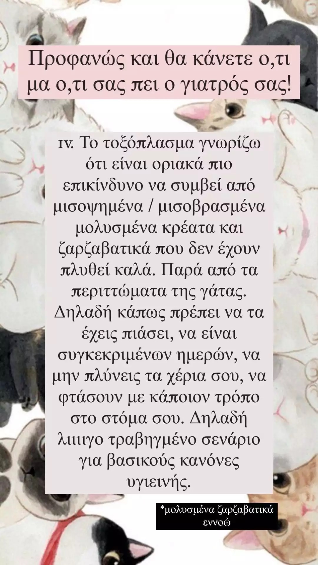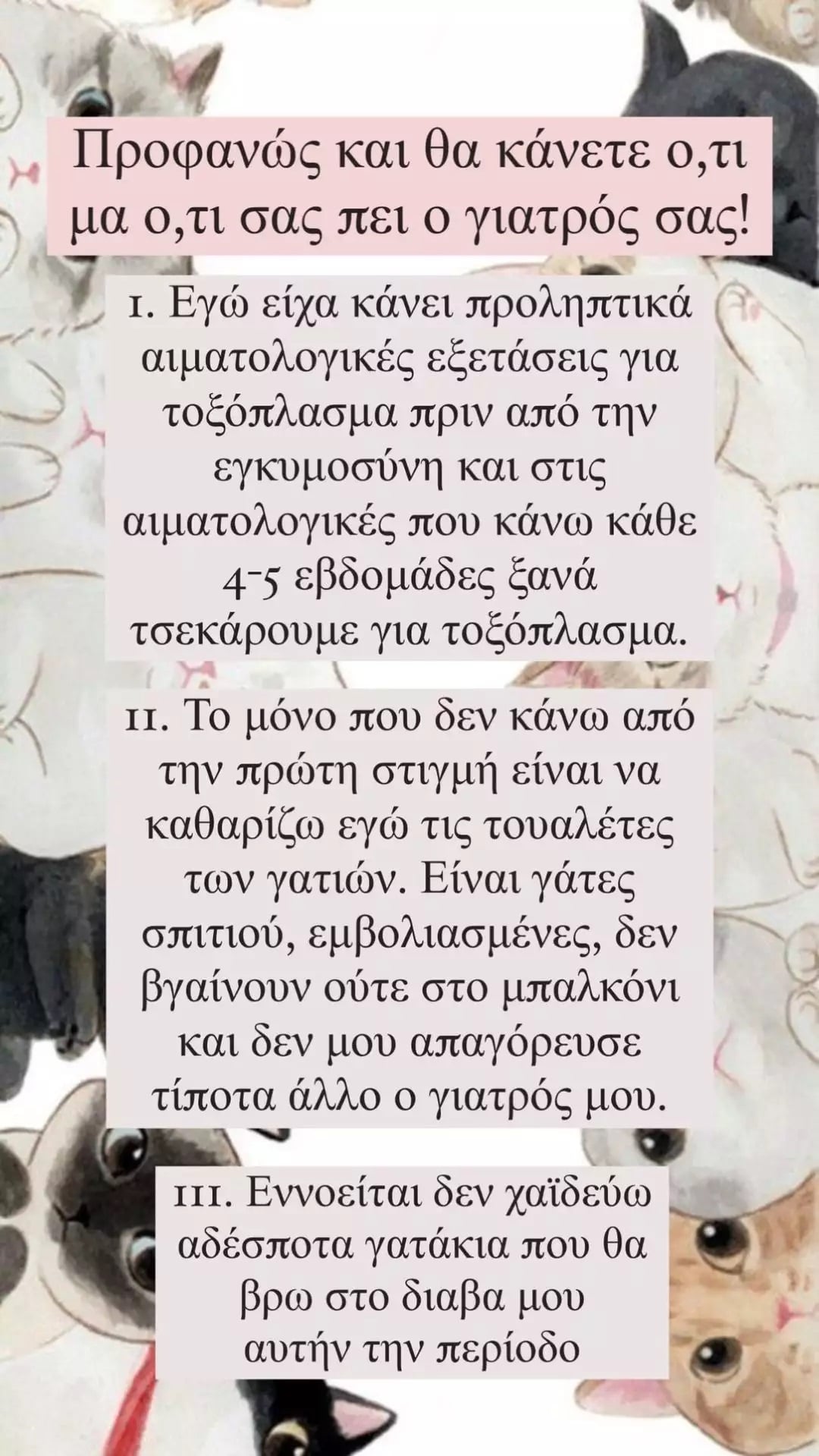 «Προφανώς και θα κάνετε ό,τι σας πει ο γιατρός σας! Εγώ είχα κάνει προληπτικά αιματολογικές εξετάσεις για τοξόπλασμα πριν από την εγκυμοσύνη και στις αιματολογικές που κάνω κάθε 4-5 βδομάδες ξανά τσεκάρουμε για τοξόπλασμα.