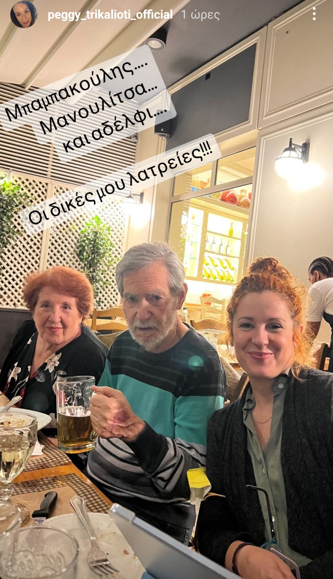 Πρόσφατα βγήκε για φαγητό με τους γονείς και την αδελφή της η Πέγκυ Τρικαλιώτη και τους φωτογράφισε να ποζάρουν στον φακό της. Στη συνέχεια δημοσίευσε τη φωτογραφία στο Instagram γράφοντας: «Μπαμπακούλης, μανουλίτσα και αδελφή. Οι δικές μου λατρείες». Σε συνέντευξή της αναφερόμενη στη γέννηση της κόρης της έχει πει: «Αυτό που έγινε με τη Φραντζέσκα ήταν ένα θαύμα.