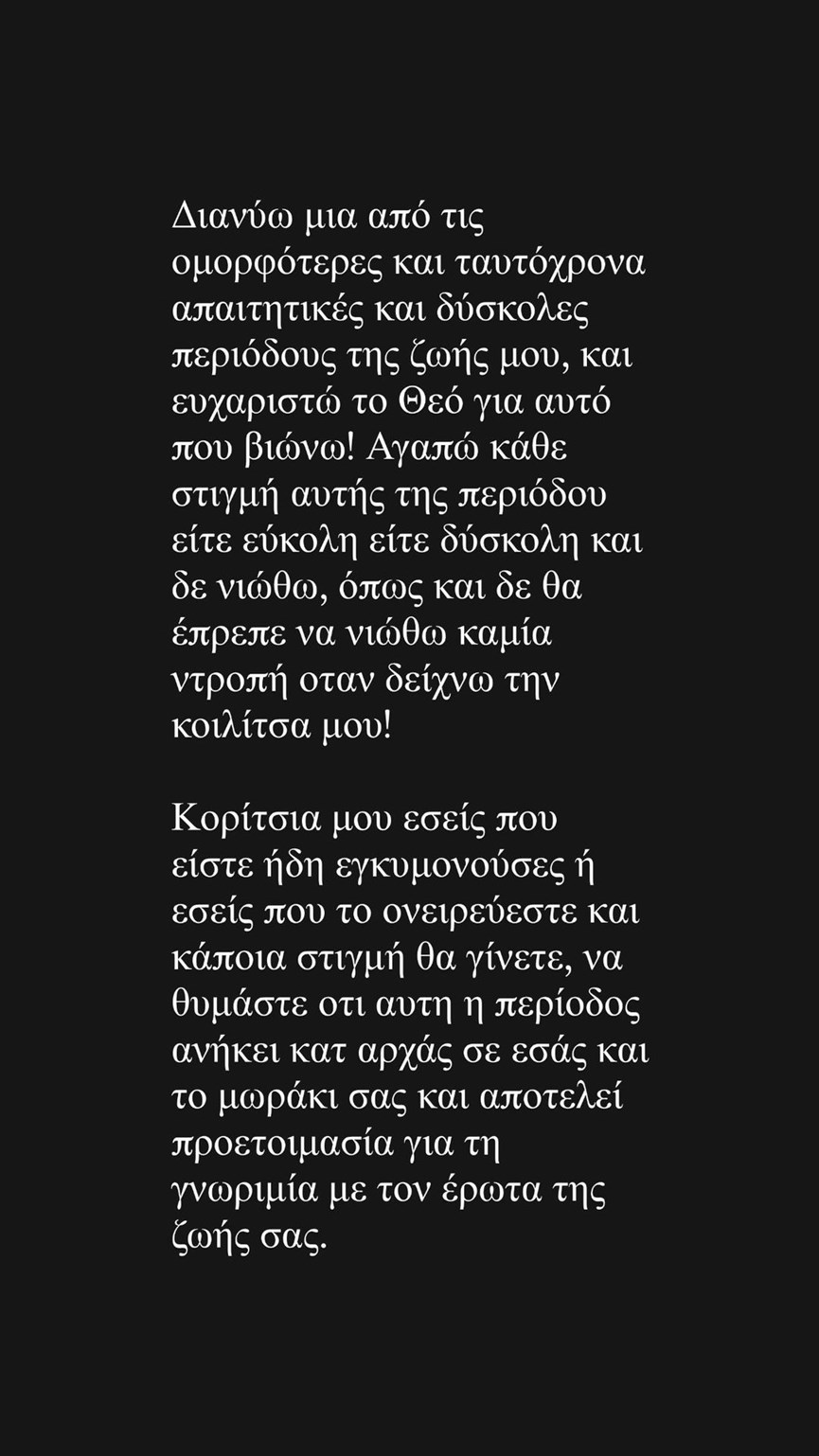 Διανύω μια από τις ομορφότερες και ταυτόχρονα απαιτητικές και δύσκολες περιόδους της ζωής μου και ευχαριστώ τον Θεό για αυτό που βιώνω. Αγαπώ κάθε στιγμή αυτής της περιόδου είτε εύκολη είτε δύσκολη και δεν νιώθω, όπως και καμιά δεν θα έπρεπε να νιώθω καμία ντροπή όταν δείχνω την κοιλίτσα μου. Κορίτσια μου εσείς που είστε ήδη εγκυμονούσες ή εσείς που το ονειρεύεστε και κάποια στιγμή θα γίνετε να θυμάστε ότι αυτή η περίοδος ανήκει καταρχάς σε εσάς και το μωράκι σας και αποτελεί προετοιμασία για τη γνωριμία με τον έρωτα της ζωής σας.