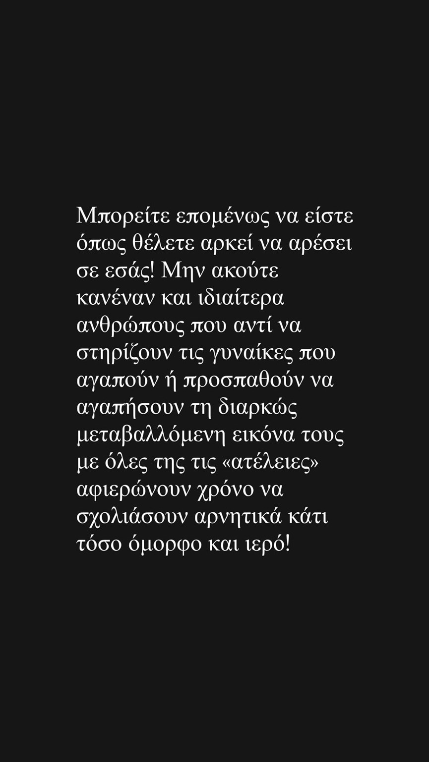 Μπορείτε επομένως να είστε όπως θέλετε αρκεί να αρέσει σε εσάς! Μην ακούτε κανέναν και ιδιαίτερα ανθρώπους που αντί να στηρίζουν τις γυναίκες που αγαπούν ή προσπαθούν να αγαπήσουν τη διαρκώς μεταβαλλόμενη εικόνα τους με όλες της τις «ατέλειες» αφιερώνουν χρόνο να σχολιάσουν αρνητικά κάτι τόσο όμορφο και ιερό».