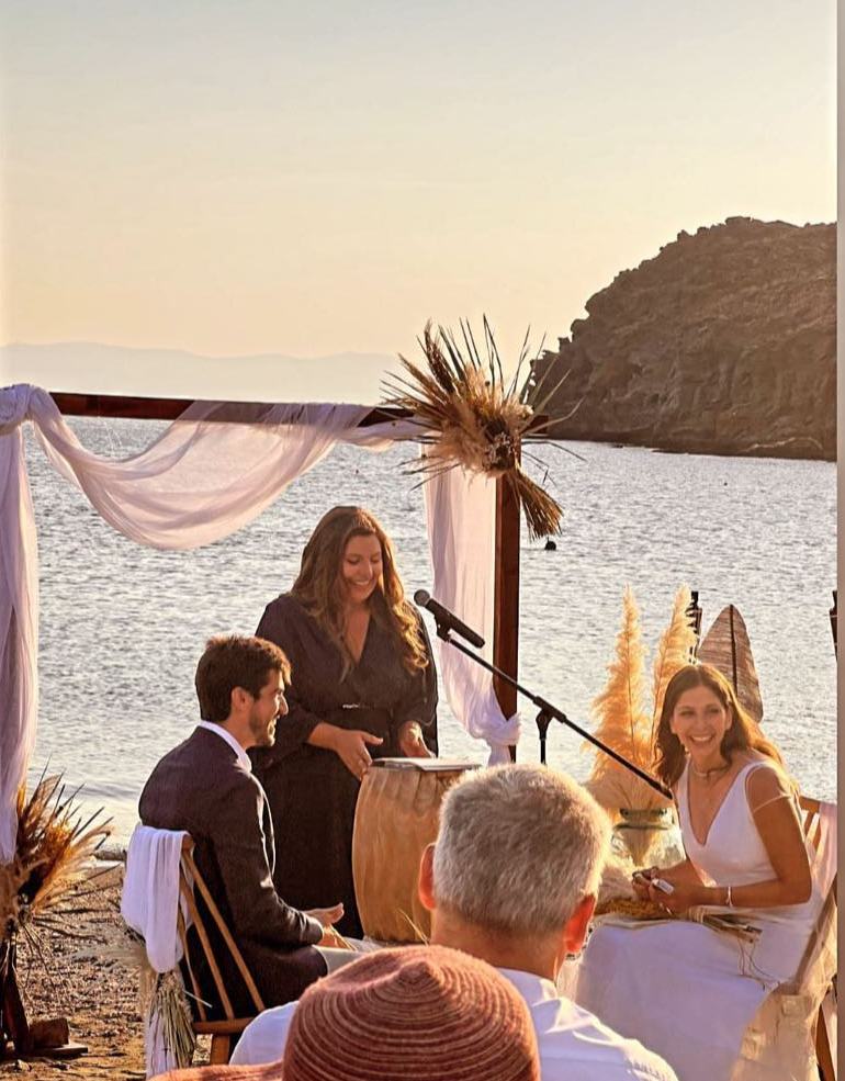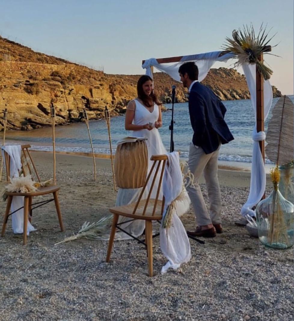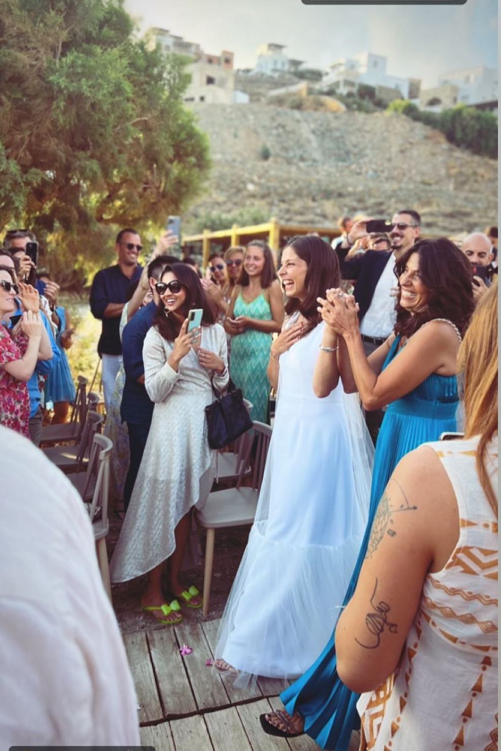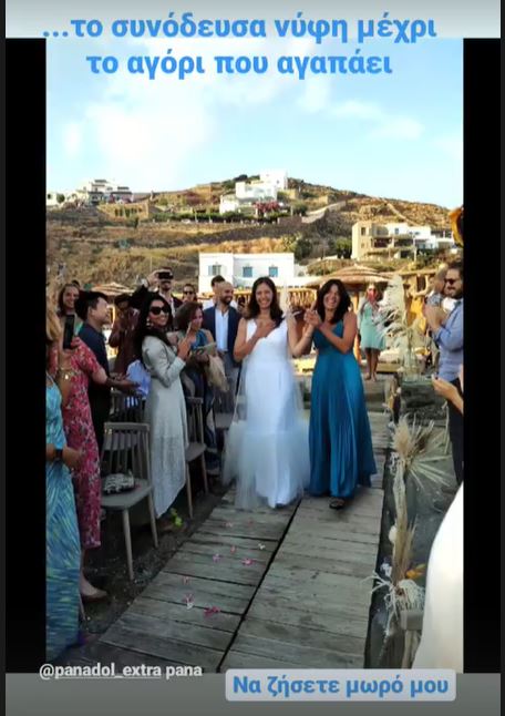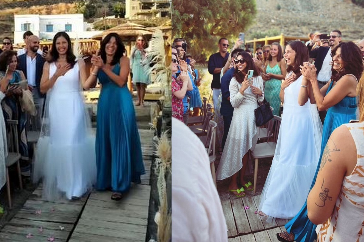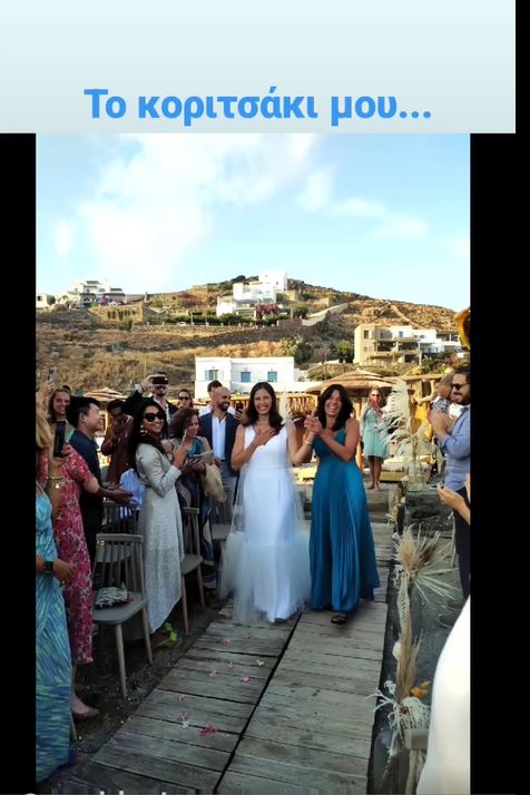 Ο γάμος έγινε στην Τήνο δίπλα στην παραλία με συγγενείς και φίλους να δίνουν το «παρών» και τη δημοσιογράφο να συνοδεύει τη κόρη της στον γαμπρό.