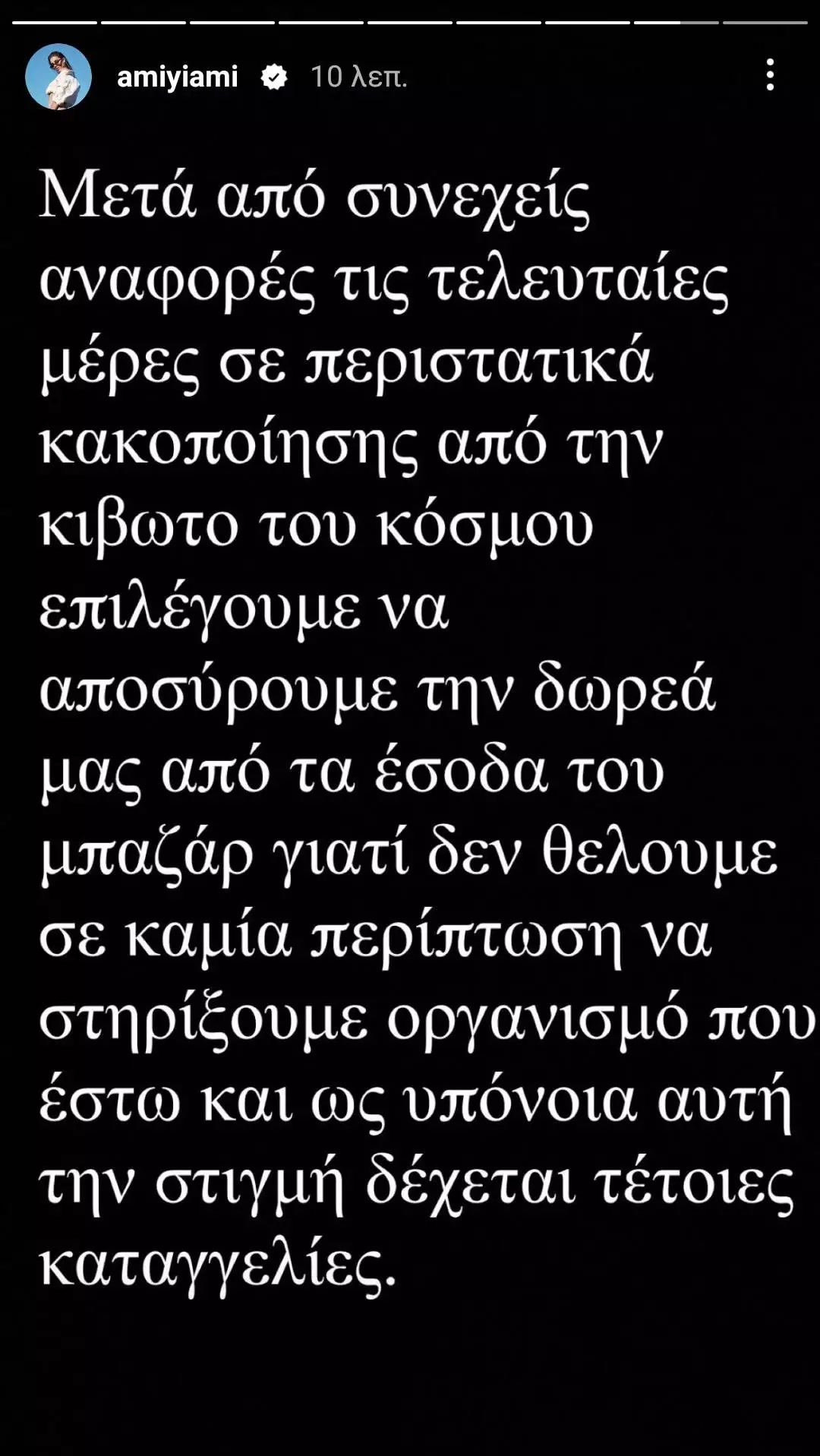 «Μετά από συνεχείς αναφορές τις τελευταίες μέρες σε περιστατικά κακοποίησης από την Κιβωτό του Κόσμου, επιλέγουμε να αποσύρουμε τη δωρεά μας από τα έσοδα του μπαζάρ γιατί δεν θέλουμε σε καμιά περίπτωση να στηρίξουμε οργανισμό που έστω και ως υπόνοια αυτή τη στιγμή δέχεται τέτοιες καταγγελίες.