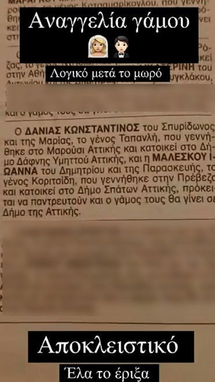 το γένος Κοριτσίδη που γεννήθηκε στην Πρέβεζα και κατοικεί στον Δήμο Σπάτων Αττικής, πρόκειται να παντρευτούν και ο γάμος τους θα γίνει σε Δήμο της Αττικής».