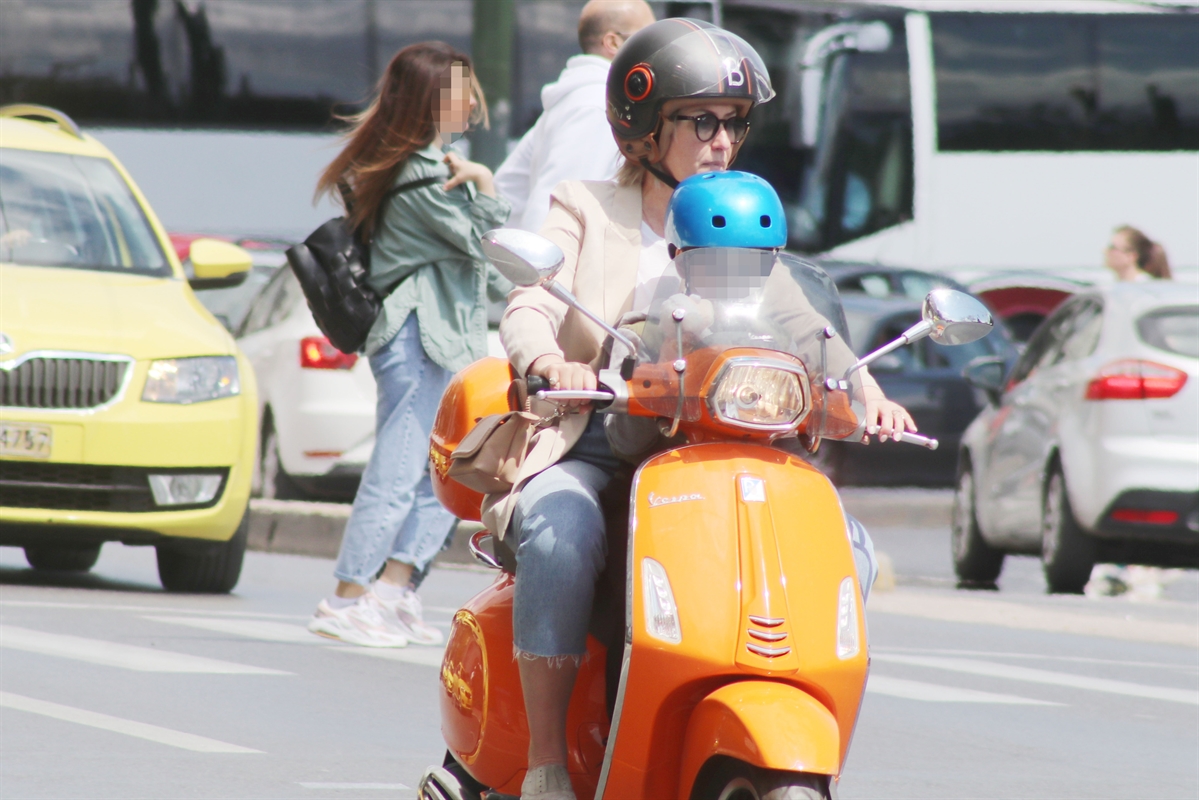 Πέρα από γυναίκα καριέρας είναι μαμά και προσπαθεί να τα προγραμματίζει όλα μέσα στην ημέρα ώστε να τα προλαβαίνει. Ο φωτογραφικός μας φακός την απαθανάτισε στο κέντρο της Αθήνας να οδηγεί τη βέσπα της έχοντας πάνω και το γιο της, Δήμο.