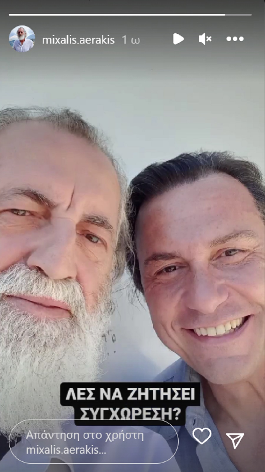 Ο Μιχάλης Αεράκης πόσταρε τη φωτογραφία στο instastory του και έγραψε: «Λέτε να ζητήσει συγχώρεση;». Ο ήρωας που υποδύεται ο Δημήτρης Αλεξανδρής είναι ένας σκοτεινός άνθρωπος που βαθιά πληγωμένος από το παρελθόν του κάνει κακό στους γύρω του χωρίς δεύτερη σκέψη.