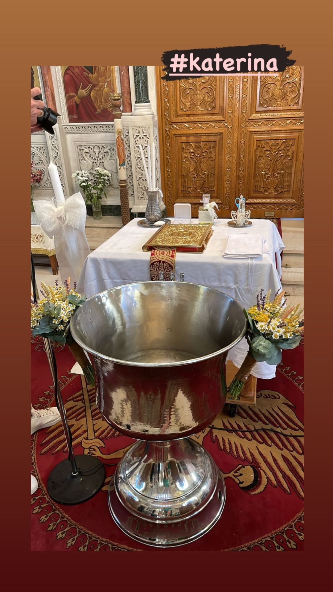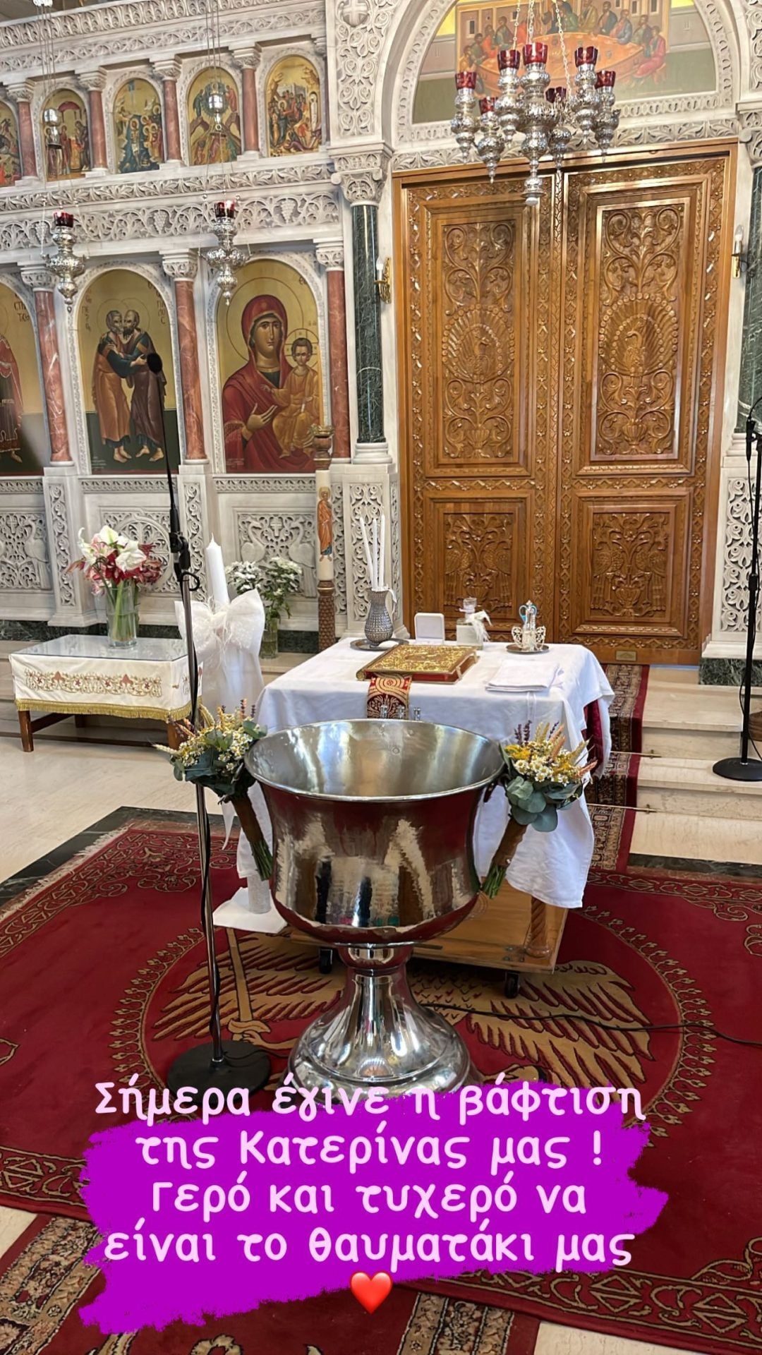 Το όνομα αυτής, Κατερίνα. Το μυστήριο έγινε γύρω στις 12 το μεσημέρι με λίγους συγγενείς και φίλους στον Ιερό Ναό Αγίων Αποστόλων Πέτρου και Παύλου.