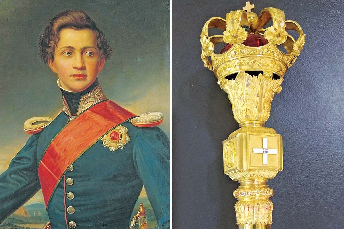 Ο Οθωνας, πρίγκιπας της Βαυαρίας, του οίκου των Βίτελσμπαχ, βασίλευσε στην Ελλάδα από το 1832 έως το 1862. Το στέμμα και το σκήπτρο κατασκευάστηκαν από τον περίφημο παρισινό οίκο χρυσοχοΐας Fossin et Fils, ενώ για το ξίφος συνεργάστηκαν οι Fossin με τον ξιφοποιό Jules Manceaux του ομώνυμου οίκου οπλοποιών.
