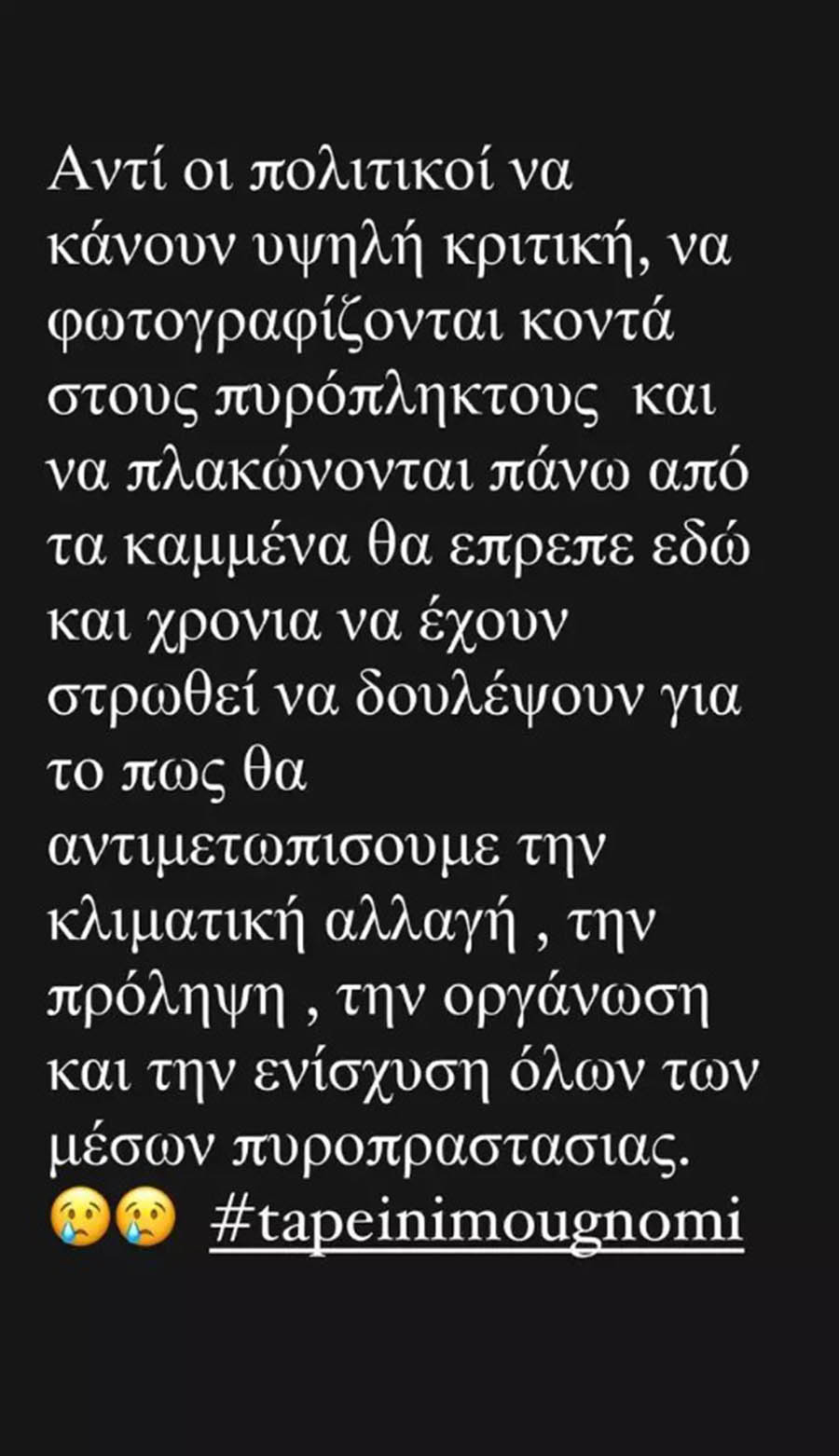 «Αντί οι πολιτικοί να κάνουν υψηλή κριτική, να φωτογραφίζονται κοντά στους πυρόπληκτους και να πλακώνονται επάνω από τα καμμένα, θα έπρεπε εδώ και χρόνια να έχουν στρωθεί να δουλέψουν για το πως θα αντιμετωπίσουμε την κλιματική αλλαγή, την πρόληψη, την οργάνωση και την ενίσχυση όλων των μέσων πυροπροστασίας #tapeinimougnomi» ήταν τα όσα έγραψε η γνωστή δημοσιογράφος.