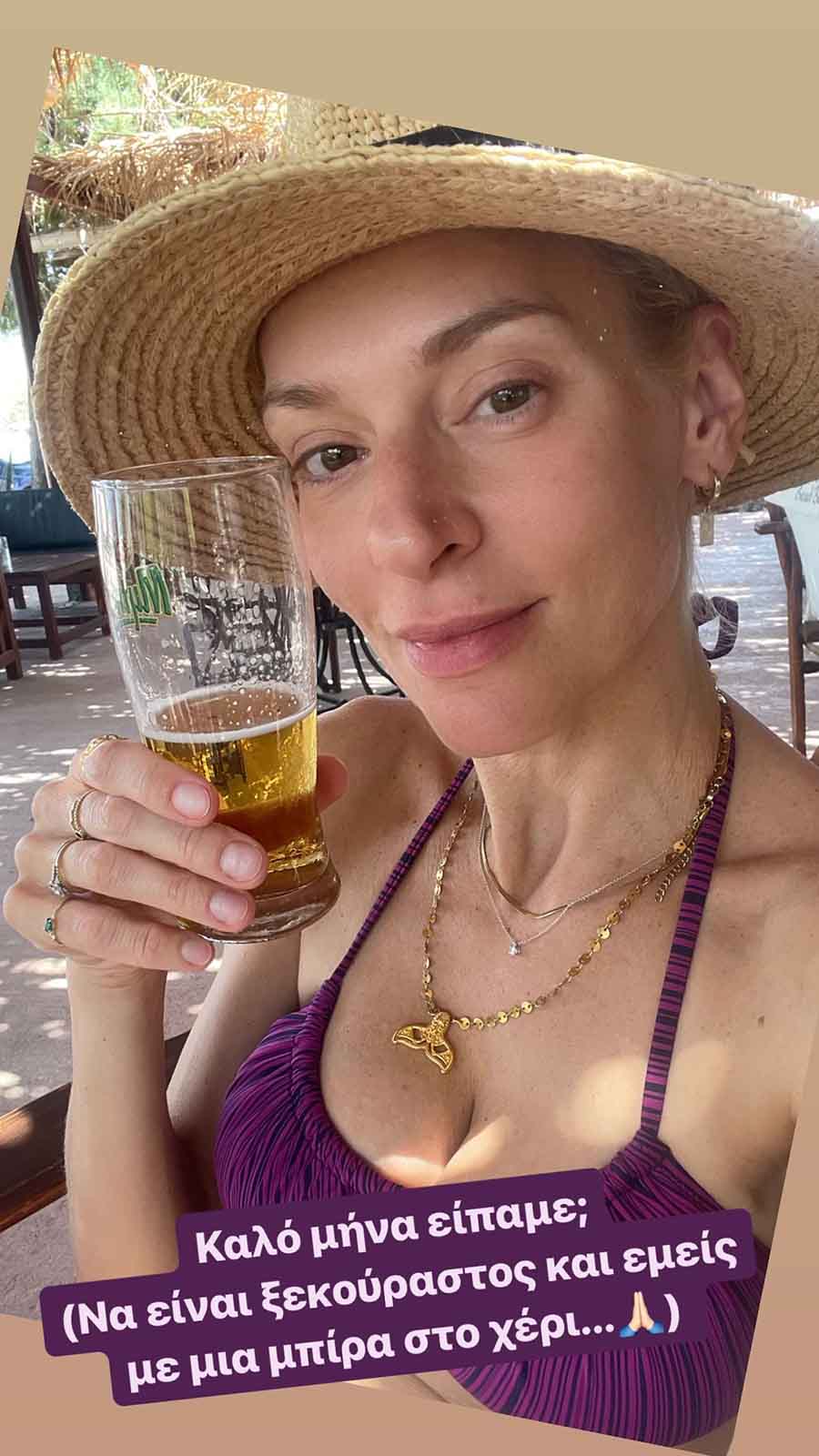 Η γνωστή ηθοποιός, ανέβασε επίσης μια ιστορία στο Instagram για να ευχηθεί καλό μήνα κρατώντας μια μπίρα και λέγοντας στους διαδικτυακούς της φίλους: «Καλό μήνα είπαμε; (Να είναι ξεκούραστος και εμείς με μία μπύρα στο χέρι..)».