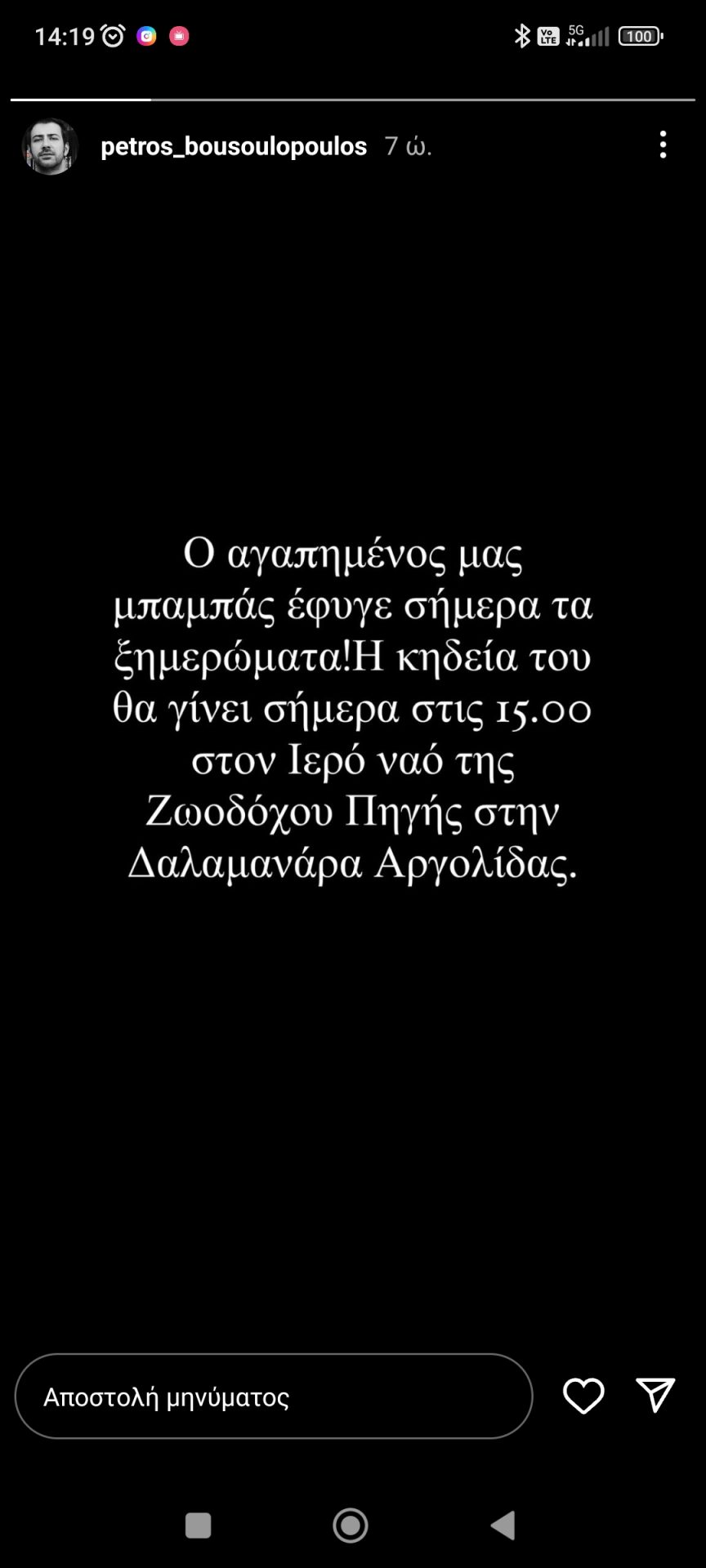 Αν ο πατέρας του αντιμετώπιζε κάποιο πρόβλημα υγείας ή έφυγε ξαφνικά αυτό δεν το γνωρίζουμε το σίγουρο είναι πως για τον ηθοποιό και την οικογένειά του οι ώρες είναι πολύ δύσκολες και τους στέλνουμε τα συλλυπητήριά μας.