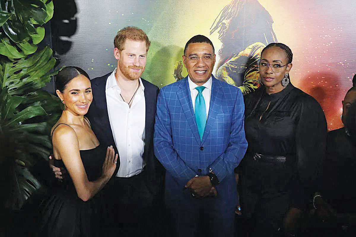 Ο δούκας και η δούκισσα του Σάσεξ βρέθηκαν στην πρεμιέρα της ταινίας «Bob Marley: One Love» στο Κίνγκστον της Τζαμάικας και περπάτησαν στο κόκκινο χαλί του Carib Theatre, με τη Μέγκαν να φοράει μαύρο σύνολο, το οποίο συνδύασε με χρυσά σκουλαρίκια. Αμέσως μετά πόζαραν δίπλα στον πρωθυπουργό Αντριου Χόλνες, ο οποίος ετοιμάζει δημοψήφισμα εντός του έτους για να καταργήσει τη μοναρχία στην Τζαμάικα, της οποίας βασιλιάς είναι ο Κάρολος.