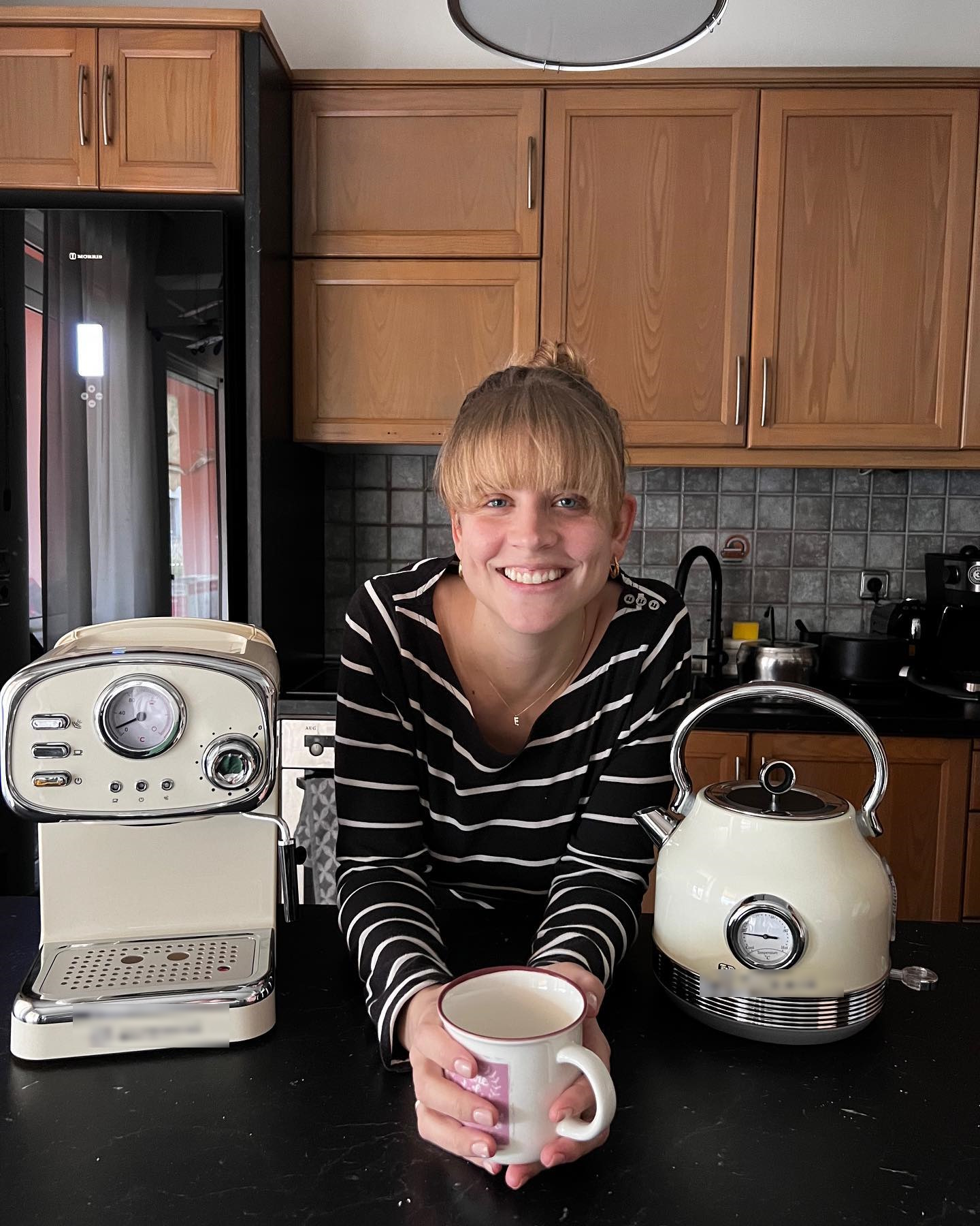 Η ηθοποιός περνάει πολλές ώρες σπίτι με το μωρό της και πόζαρε να απολαμβάνει τον καφέ στην κουζίνα του σπιτιού της και στη συνέχεια δημοσίευσε τη φωτογραφία στο instagram.
