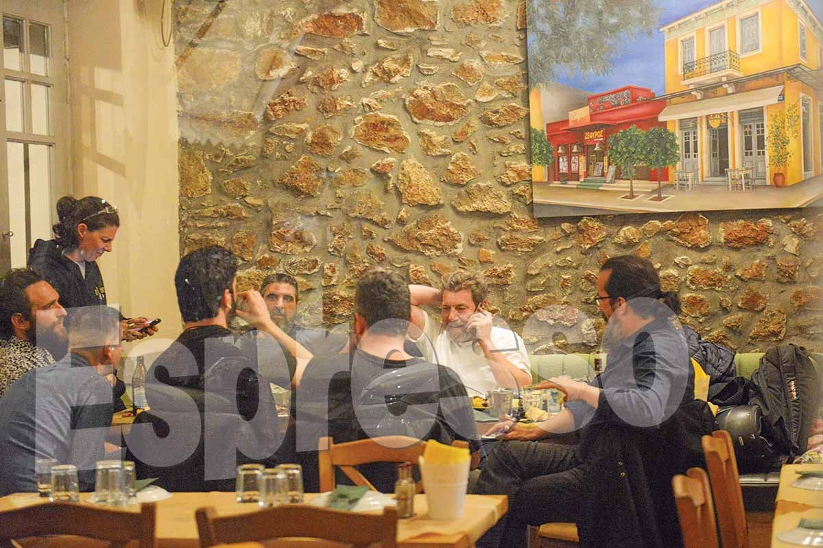 Ας πάρουμε τα πράγματα από την αρχή. Βράδυ Τετάρτης και ο φωτογράφος μας βρίσκεται στην οδό Τρώων, μία από τις πιο γνωστές οδούς της περιοχής, η οποία φημίζεται για τα εστιατόρια (από γκουρμέ μέχρι ταβέρνες) και στην οποία συχνά πυκνά μπορεί να συναντήσει κανείς γνωστά πρόσωπα. Ετσι, λοιπόν, την ώρα που βρίσκεται έξω από το εστιατόριο Λεμονανθός, βλέπει στο εσωτερικό του να κάθονται μερικοί από τους πιο γνωστούς και αγαπητούς ηθοποιούς που μάλιστα πρωταγωνιστούν φέτος σε πετυχημένες σειρές.