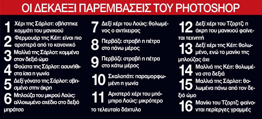 Οταν τα AFP, Associated Press, Getty Images και Reuters ανακοίνωσαν την απόσυρση της φωτογραφίας, η «Daily Mail» παρουσίασε ένα ένα τα σημεία της που έχουν παραποιηθεί με photoshop. Οι βασικές αλλοιώσεις παρατηρήθηκαν στο φερμουάρ του πουλόβερ της Κέιτ και το μανίκι της μπλούζας του αριστερού χεριού της πριγκίπισσας Σάρλοτ.