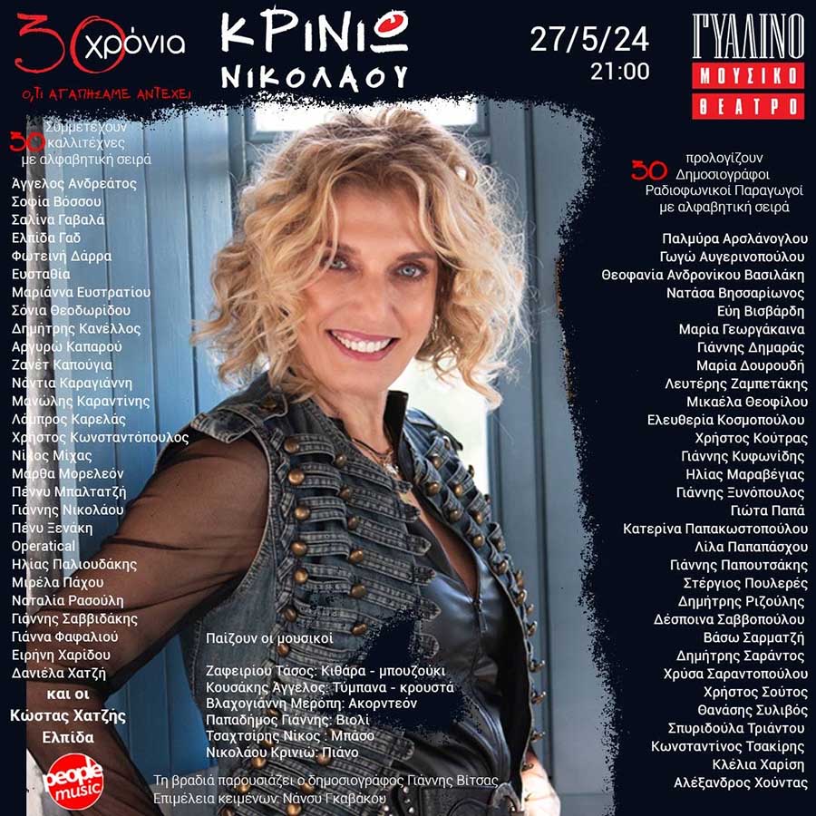 Η μουσική είναι μια γλώσσα που ξεπερνά τα σύνορα του χρόνου και του χώρου! Η Κρινιώ Νικολάου μας το έχει αποδείξει με κάθε νότα που παίζει και κάθε στίχο που τραγουδάει. Με το ταλέντο της και την αφοσίωσή της, έχει καταφέρει να αγγίξει τις καρδιές μας και να μας συντροφεύει σε κάθε στιγμή της ζωής μας. Ένας άνθρωπος πρωτίστως με καλοσύνη και καθαρότητα. Μια πορεία γεμάτη συναισθήματα, εμπνεύσεις, αναμνήσεις αλλά ταυτόχρονα ελεύθερη στο να κινείται με τους δικούς της κανόνες.