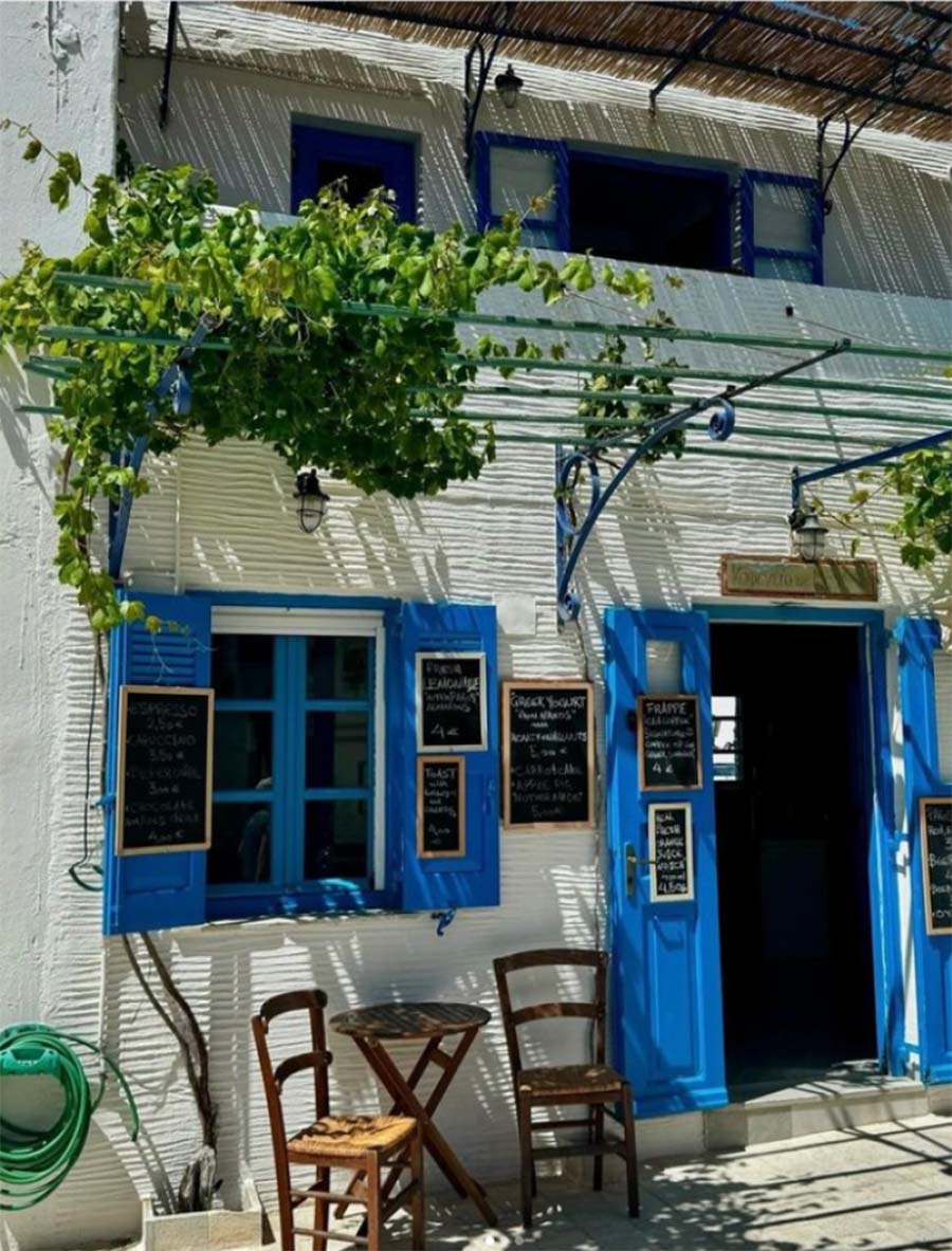 Ενα από τα στιγμιότυπα που μοιράστηκε με τους πάνω από 42 εκατομμύρια ακολούθους της στο Instagram απεικονίζει την μπλε πόρτα ενός μαγαζιού με το μενού γραμμένο σε μικρούς μαυροπίνακες, το οποίο σε κάποιους θύμισε το περίφημο Καφενείο της Μαριγώς, στις Λεύκες της Πάρου.
